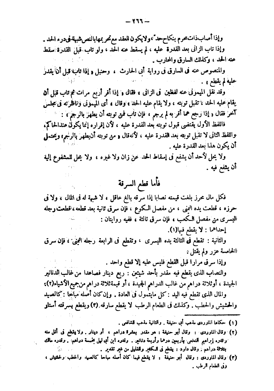 والمنصوص عنه في السارق في رواية أبي الحارث، وحنبل " إذا تاب قبل أن يقدر عليه ولم يقطع". وقد نقل الميموني عنه لفظين في الزاني، فقال: " إذا أقر أربع مرات ثم تاب قبل أن يقام عليه الحد، تقبل توبته، ولا يقام عليه الحد ". وقال: أي الميموني وناظرته في مجلس آخر فقال: " إذا رجع عما أقر به لم يرجم، فإن تاب فمن توبته أن يطهر بالرجم". فاللفظ الأول يقتضي قبول توبته بعد القدرة عليه، لأن إقراره إنما يكون عند الحاكم، واللفظ الثاني لا تقبل توبته بعد القدرة عليه، لأنه قال " من توبته أن يطهر بالرجم" ويحتمل أن يكون هذا بعد القدرة عليه. وَلَا يَحِلُّ لِأَحَدٍ أَنْ يَشْفَعَ فِي إسْقَاطِ الحد عَنْ زَانٍ وَلَا غَيْرِهِ، وَلَا يَحِلُّ لِلْمَشْفُوعِ إليه أن يشفع فيه. فأما قطع السرقة فكل مال بلغت قيمته نصابا إذاسرقه بَالِغٌ عَاقِلٌ، لَا شُبْهَةَ لَهُ فِي الْمَالِ، وَلَا فِي حِرْزِهِ، قُطِعَتْ يَدُهُ الْيُمْنَى، مِنْ مِفْصَلِ الْكُوعِ، فَإِنْ سَرَقَ ثَانِيَةً بَعْدَ قَطْعِهِ، قُطِعَتْ رِجْلُهُ الْيُسْرَى مِنْ مِفْصَلِ الْكَعْبِ، فَإِنْ سرق ثالثة، ففيه روايتان: إحداهما: لا يقطع فيهما. والثانية: تقطع في الثالثة يده اليسرى، وتقطع في الرابعة رجله اليمنى، فإن سرق الخامسة عزر ولم يقتل. وإذا سَرَقَ مِرَارًا قَبْلَ الْقَطْعِ فَلَيْسَ عَلَيْهِ إلَّا قطع واحد. والنصاب الذي يقطع فيه مقدر بأحد شيئين: ربع دينار فصاعدا من غالب الدنانير الجيدةن أو ثلاثة دراهم من غالب الدراهم الجيدة، أو قيمة ثلاثة دراهم من جميع الأشياء. والمال الذي تقطع فيه اليد: كل ما يتمول في العادة، وإن كان أصله مباحا: كالصيد والحشيش والحطب، وكذلك في الطعام الرطب لايقطع سارقه ويقطع بسرقته أستار