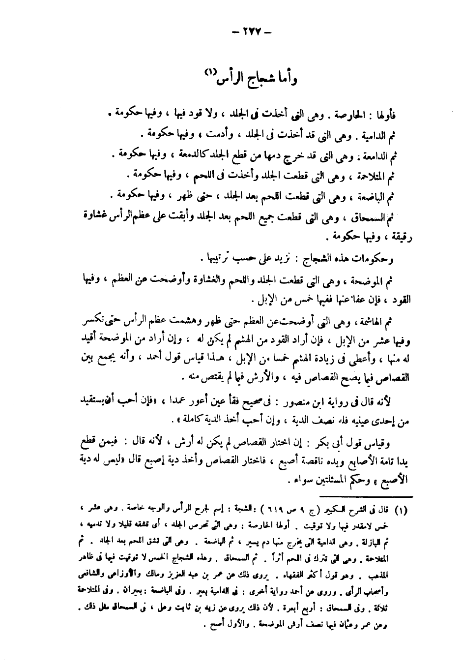 وأما شجاج الرأس فأولهما: الحارصة: وَهِيَ الَّتِي أَخَذَتْ فِي الْجِلْدِ، وَلَا قَوَدَ فيها، وفيها حكومة. ثم الدامية: وهي التي قد أَخَذَتْ فِي الْجِلْدِ، وَأَدَمَتْ، وَفِيهَا حُكُومَةٌ. ثُمَّ الدامعة: وهي التي قد خرج دمها من قطع الجلد كالدمعة، وَفِيهَا حُكُومَةٌ. ثُمَّ الْمُتَلَاحِمَةُ: وَهِيَ الَّتِي قَطَعَتْ الجلد وَأَخَذَتْ فِي اللَّحْمِ، وَفِيهَا حُكُومَةٌ. ثُمَّ الْبَاضِعَةُ: وهي التي قطعت اللحم بعد الجلد، حتى ظهر، وَفِيهَا حُكُومَةٌ. ثُمَّ السِّمْحَاقُ: وَهِيَ الَّتِي قَطَعَتْ جَمِيعَ اللَّحْمِ بَعْدَ الْجِلْدِ وَأَبْقَتْ عَلَى عَظْمِ الرَّأْسِ غِشَاوَةً رَقِيقَةً، وَفِيهَا حُكُومَةُ. وَحُكُومَاتُ هَذِهِ الشِّجَاجِ: تَزِيدُ عَلَى حَسَبِ تَرْتِيبِهَا. ثُمَّ الْمُوضِحَةُ، وَهِيَ الَّتِي قَطَعَتْ الْجِلْدَ وَاللَّحْمَ وَالْغِشَاوَةَ وَأَوْضَحَتْ عن العظم، وفيها القود، فإن عفا عَنْهَا فَفِيهَا خَمْسٌ مِنْ الْإِبِلِ.