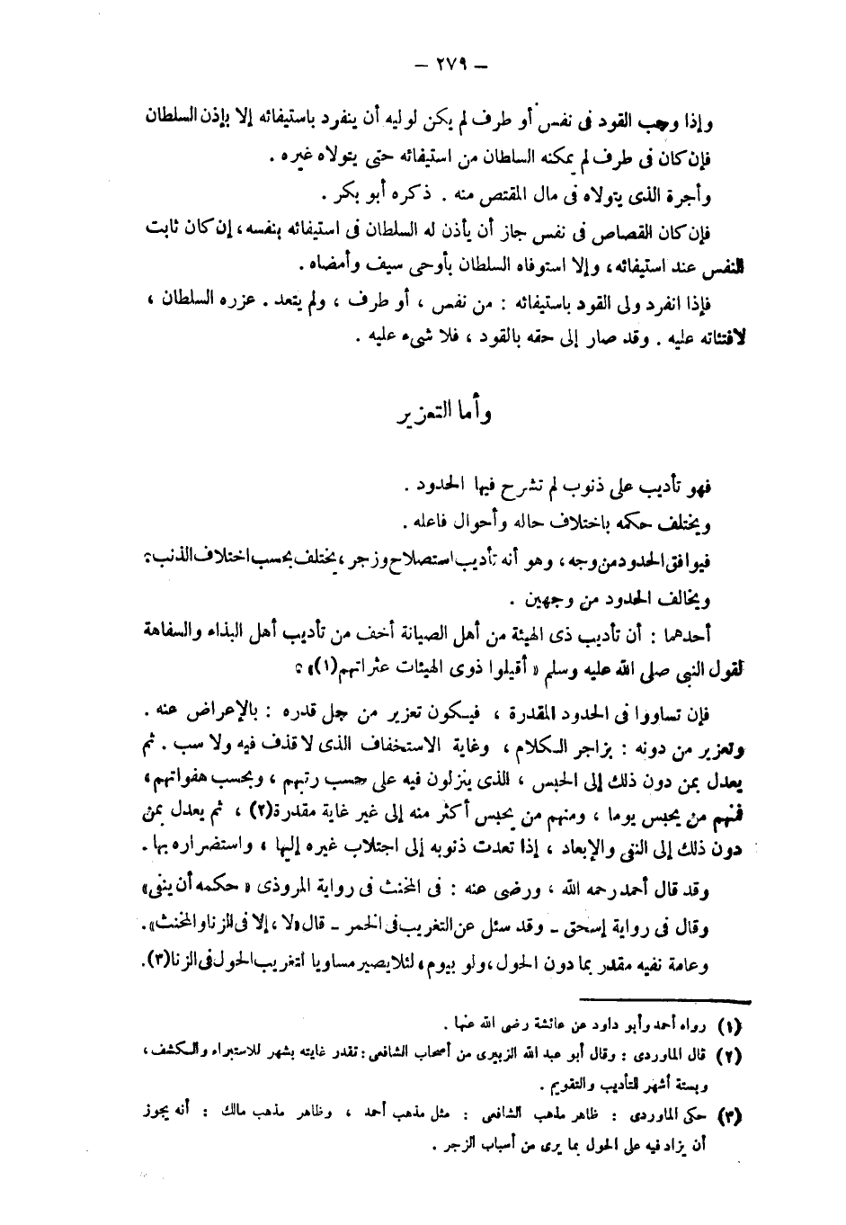 وَإِذَا وَجَبَ الْقَوَدُ فِي نَفْسٍ أَوْ طَرَفٍ لَمْ يَكُنْ لِوَلِيِّهِ أَنْ يَنْفَرِدَ بِاسْتِيفَائِهِ إلَّا بِإِذْنِ السُّلْطَانِ فَإِنْ كَانَ فِي طَرَفٍ لَمْ يُمَكِّنْهُ السُّلْطَانُ مِنْ اسْتِيفَائِهِ حَتَّى يَتَوَلَّاهُ غَيْرُهُ. وأجرة إلي يتولاه في مال المقتص منه. ذكره أبو بكر. فَإِنْ كَانَ الْقِصَاصُ فِي نَفْسٍ جَازَ أَنْ يأذن له السلطان في استيفائه بنفسه، إن كان ثابت النفس عند استيفائه، وإلا استوفاه السلطان بأوحى سيف وأمضاه. فإذا انفرد وَلِيُّ الْقَوَدِ بِاسْتِيفَائِهِ، مِنْ نَفْسٍ أَوْ طَرَفٍ، ولم يتعد، عزره السلطان، لاقتنائهئن وقد صار إلى حقه بالقود، فلا شيء عليه. وما التعزير فهو تأديب على ذنوب لم تشرح فيها الحدود. ويختلف حكمه باختلاف حاله وأحواله فاعله. فيوافق الحدود من وجه، وهو أنه تأديب استصلاح وزجر، ويختلف بحسب اختلاف الذنب، ويخالف الحدود من وجهين. أحدهما: أن تأديب ذي الهيئة مِنْ أَهْلِ الصِّيَانَةِ أَخَفُّ مِنْ تَأْدِيبِ أَهْلِ البذاء وَالسَّفَاهَةِ لِقَوْلِ النَّبِيِّ - صَلَّى اللَّهُ عَلَيْهِ وَسَلَّمَ - " أقيلوا ذوي الهيئات عثراتهم". فَإِنْ تُسَاوَوْا فِي الْحُدُودِ الْمُقَدَّرَةِ، فَيَكُونُ تَعْزِيرُ مَنْ جَلَّ قَدْرُهُ، بِالْإِعْرَاضِ عَنْهُ. وَتَعْزِيرُ مَنْ دونه: بزاجر الكلام، وغاية الاستخفاف الذي لا قذف فيه ولا سب، ثم يعد بمن دون ذلك إلى الحبس، الذي ينزلون فيه على حسب رتبهم، وَبِحَسَبِ هَفَوَاتِهِمْ، فَمِنْهُمْ مَنْ يُحْبَسُ يَوْمًا، وَمِنْهُمْ من يحبس أكثر منه إلى غير غاية مقدرة، ثُمَّ يُعْدَلُ بِمَنْ دُونَ ذَلِكَ إلَى النَّفْيِ والإبعاد، إذا تعدت ذنوبه إلى اجتلاب غيره إليها، واستضراره بها.