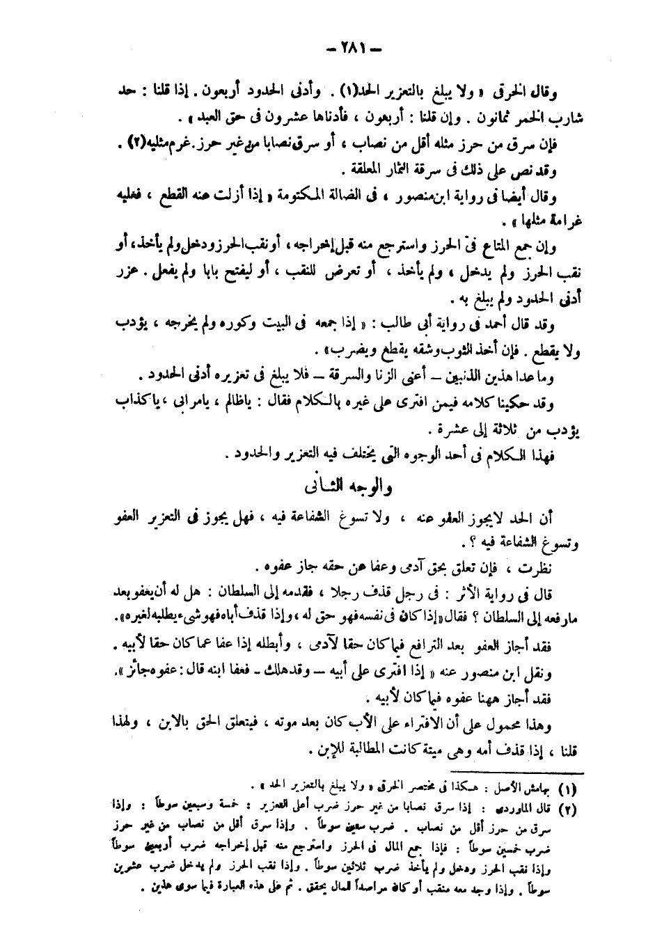 وقال الخرقي " ولا يبلغ بالتعزير الحد، وأدنى الحدود أربعون. إذا قلنا: حد شارب الخمر ثمانون، وإن قلنا: أربعون، فأدناها عشرون في حق العبد". فإن سرق من حرز مثله أقل من نصاب، أو سرق نصابا من غير حرز غرم مثليه وقد نص على ذلك في سرقة الثمار المعلقة. وقا لأيضا في رواية ابن منصور، في الضالة المكتومة، " إذا أزلت عنه القطع، فعليه غرامة مثلها". وإن جمع المتاع في الحرز واسترجع منه قبل إخراجه، أو نقب الحرز ودخل ولم يأخذ، أو نقب الحرز ولم يدخل، ولم يأخذ، أو تعرض للنقب، أو ليفتح بابا ولم يفعل، غزر أدنى الحدود ولم يبلغ به. وقد قال أحمد في رواية أبي طالب: " إذا جمعه في البيت وكوره ولم يخرجه، يؤدب ولا يقطع، فإن أخذ الثوب وشقه يقطع ويضرب". وما عدا هذين الذنبين - أعني الزنا والسرقة - فلا يبلغ في تعزيره أدنى الحدود، وقد حكينا كلامه فيمن افترى على غيره بالكلام فقال: يا ظالم، يا مرابي، يا كذاب يؤدب من ثلاثة إلى عشرة. فهذا الكلام في أحد الوجوه التي يختلف فيه التعزير والحدود. والوجه الثاني أن الحد لا يجوز العفو عنه، ولا تسوغ الشفاعة فيه، فهل يجوز في التعزير العفو وتسوغ الشفاعة فيه؟. نظرت، فإن تعلق بحق آدمي وعفا عن حقه جاز عفوه. قال في رواية الأثر: في رجل قذف رجلا، فقدمه إلى السلطان: هل له أن يعفو بعد ما رفعه إلى السلطان؟ فقال " إذا كان في نفسه فهو حق له، وإذا قذف أبه فهو شيء يطلبه لغيره".