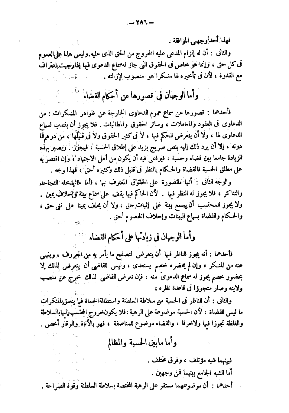 وَأَمَّا الْوَجْهَانِ فِي قُصُورِهَا عَنْ أَحْكَامِ الْقَضَاءِ فَأَحَدُهُمَا: قُصُورُهَا عَنْ سَمَاعِ عُمُومِ الدَّعَاوَى الْخَارِجَةِ عَنْ ظَوَاهِرِ الْمُنْكَرَاتِ: مِنْ الدَّعَاوَى فِي الْعُقُودِ وَالْمُعَامَلَاتِ، وَسَائِرِ الْحُقُوقِ وَالْمُطَالَبَاتِ، فَلَا يَجُوزُ أن ينتدب لسماع الدعاوى لَهَا، وَلَا أَنْ يَتَعَرَّضَ لِلْحُكْمِ فِيهَا، لَا فِي كَثِيرِ الْحُقُوقِ وَلَا فِي قَلِيلِهَا، مِنْ دِرْهَمٍ فَمَا دُونَهُ، إلَّا أَنْ يَرِدَ ذَلِكَ إليه بنص صريح يزيد على إطلاقه الْحِسْبَةِ، فَيَجُوزُ وَيَصِيرُ بِهَذِهِ الزِّيَادَةِ جَامِعًا بَيْنَ قَضَاءٍ وَحِسْبَةٍ، فَيُرَاعَى فِيهِ أَنْ يَكُونَ مِنْ أهل الاجتهاد، وإن اقتصر به على مُطْلَقِ الْحِسْبَةِ فَالْقُضَاةُ وَالْحُكَّامُ بِالنَّظَرِ فِي قَلِيلِ ذلك وكثير أَحَقُّ، فَهَذَا وَجْهٌ. وَالْوَجْهُ الثَّانِي: أَنَّهَا مَقْصُورَةٌ على الحقوق المعترف بها، فأما ما يدخله التجاحد والتناكر، فلا يجوز له النظر فيها، لأن الحاكم فيها يقف على سماع بينة وإحلاف يمين. ولا يجوز للمتحسب أن يسمع بينة على إثبات حق، ولا أن يحلف يمينا على نفي حق، والحكام والقضاة بسماع البينات وإحلاف الخصوم أحق. وما الْوَجْهَانِ فِي زِيَادَتِهَا عَلَى أَحْكَامِ الْقَضَاءِ فَأَحَدُهُمَا: أَنَّهُ يَجُوزُ لِلنَّاظِرِ فِيهَا أَنْ يَتَعَرَّضَ لِتَصَفُّحِ مَا يَأْمُرُ بِهِ مِنْ الْمَعْرُوفِ، وَيَنْهَى عَنْهُ من المنكر، وإن لم يحضره خصم يستعدي، وَلَيْسَ لِلْقَاضِي أَنْ يَتَعَرَّضَ لِذَلِكَ إلَّا بِحُضُورِ خَصْمٍ يَجُوزُ لَهُ سَمَاعُ الدَّعْوَى مِنْهُ، فَإِنْ تَعَرَّضَ الْقَاضِي لِذَلِكَ خَرَجَ عَنْ مَنْصِبِ وِلَايَتِهِ وَصَارَ مُتَجَوِّزًا فِي قَاعِدَةِ نَظَرِهِ. وَالثَّانِي: أَنَّ لِلنَّاظِرِ فِي الْحِسْبَةِ مِنْ سَلَاطَةِ السَّلْطَنَةِ وَاسْتِطَالَةِ الحماة فيما يتعلق بِالْمُنْكَرَاتِ مَا لَيْسَ لِلْقُضَاةِ، لِأَنَّ الْحِسْبَةَ مَوْضُوعَةٌ على الرهبة، فَلَا يَكُونُ خُرُوجُ الْمُحْتَسِبِ إلَيْهَا بِالسَّلَاطَةِ وَالْغِلْظَةِ تَجَوُّزًا فِيهَا وَلَا خَرْقًا، وَالْقَضَاءُ مَوْضُوعٌ لِلْمُنَاصَفَةِ، فهو بالأناة والوقار أخص. وَأَمَّا مَا بَيْنَ الْحِسْبَةِ وَالْمَظَالِمِ فَبَيْنَهُمَا شَبَهٌ مؤتلف، وفرق مختلف أما الشَّبَهُ الْجَامِعُ بَيْنَهُمَا فَمِنْ وَجْهَيْنِ. أَحَدُهُمَا: أَنَّ مَوْضُوعَهُمَا مُسْتَقِرٌّ عَلَى الرَّهْبَةِ الْمُخْتَصَّةِ بِسَلَاطَةِ السَّلْطَنَةِ وقوة الصراحة.