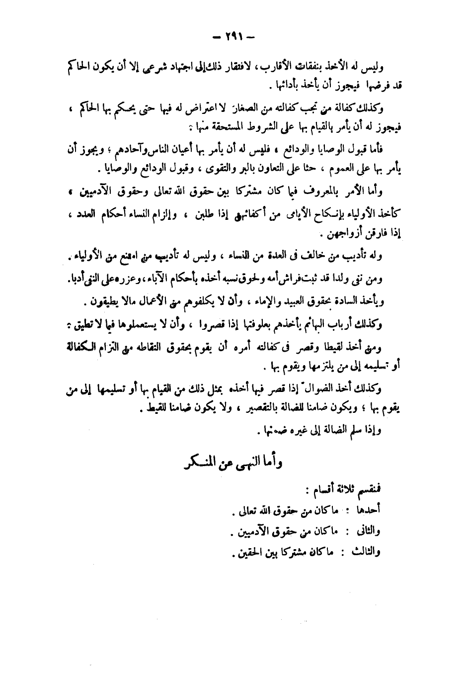 وَلَيْسَ لَهُ الْأَخْذُ بِنَفَقَاتِ الْأَقَارِبِ، لِافْتِقَارِ ذَلِكَ إلى اجتهاد شرعي إلَّا أَنْ يَكُونَ الْحَاكِمُ قَدْ فَرَضَهَا فَيَجُوزُ أن يأخذ بِأَدَائِهَا. وَكَذَلِكَ كَفَالَةُ مَنْ تَجِبُ كَفَالَتُهُ مِنْ الصغار لا اعتراض لَهُ فِيهَا حَتَّى يَحْكُمَ بِهَا الْحَاكِمُ، فَيَجُوزُ له أَنْ يَأْمُرَ بِالْقِيَامِ بِهَا عَلَى الشُّرُوطِ الْمُسْتَحَقَّةِ منها. فأما قَبُولُ الْوَصَايَا وَالْوَدَائِعِ، فَلَيْسَ لَهُ أَنْ يَأْمُرَ بها أَعْيَانَ النَّاسِ وَآحَادَهُمْ، وَيَجُوزُ أَنْ يَأْمُرَ بِهَا عَلَى الْعُمُومِ، حَثًّا عَلَى التَّعَاوُنِ بِالْبِرِّ وَالتَّقْوَى، وقبول الودائع الوصايا. وَأَمَّا الْأَمْرُ بِالْمَعْرُوفِ فِيمَا كَانَ مُشْتَرَكًا بَيْنَ حقوق الله تعالى وحقوق الآدميين، كأخذ الأولياء بإنكاح الأيامى من أكفائهم إذَا طَلَبْنَ، وَإِلْزَامِ النِّسَاءِ أَحْكَامَ الْعِدَدِ، إذَا فارقن أزواجهن. وَلَهُ تَأْدِيبُ مَنْ خَالَفَ فِي الْعِدَّةِ مِنْ النِّسَاءِ، وَلَيْسَ لَهُ تَأْدِيبُ مَنْ امْتَنَعَ مِنْ الْأَوْلِيَاءِ. وَمَنْ نَفَى وَلَدًا قَدْ ثَبَتَ فِرَاشُ أمه ولحوق نسبه أخذه بأحكام الآباء، وعزره على النَّفْيِ أَدَبًا. وَيَأْخُذُ السَّادَةَ بِحُقُوقِ الْعَبِيدِ وَالْإِمَاءِ، وأن لا يكلفوهم مِنْ الْأَعْمَالِ مَا لَا يُطِيقُونَ. وَكَذَلِكَ أَرْبَابُ البهائم بأخذهم بِعُلُوفَتِهَا إذَا قَصَّرُوا، وَأَنْ لَا يَسْتَعْمِلُوهَا فِيمَا لَا تُطِيقُ. وَمَنْ أَخَذَ لَقِيطًا وَقَصَّرَ فِي كَفَالَتِهِ أَمَرَهُ أَنْ يَقُومَ بِحُقُوقِ الْتِقَاطِهِ مِنْ التزام الكفالة أَوْ تَسْلِيمِهِ إلَى مَنْ يَلْتَزِمُهَا وَيَقُومُ بِهَا. وكذلك أخذ الضوال إذا قصر فيها أخذه بمثل ذلك من القيام بها أو تسليمها إلى من يقوم بِهَا، وَيَكُونُ ضَامِنًا لِلضَّالَّةِ بِالتَّقْصِيرِ، وَلَا يَكُونُ ضامنا للقيط. وإذا سلم الضالة إلى غيره ضمتها. وأما النهي عن المنكر فمنقسم ثَلَاثَةَ أَقْسَامٍ: أَحَدُهَا: مَا كَانَ مِنْ حُقُوقِ اللَّهِ تَعَالَى. وَالثَّانِي: مَا كَانَ مِنْ حُقُوقِ الْآدَمِيِّينَ. وَالثَّالِثُ: مَا كَانَ مُشْتَرَكًا بَيْنَ الْحَقَّيْنِ.