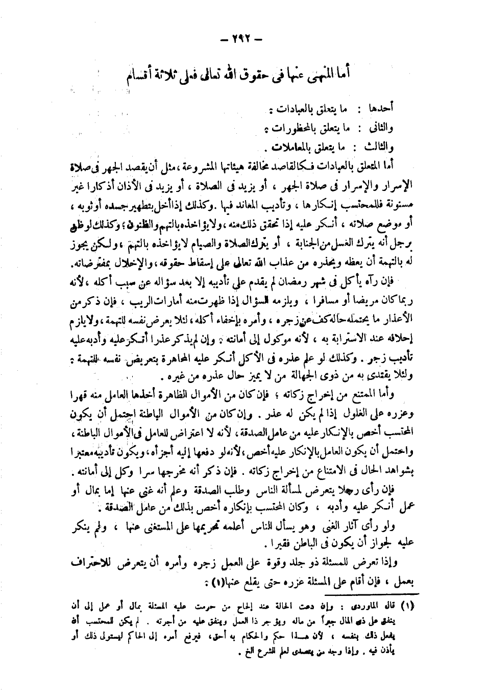 أما المنهي عَنْهَا فِي حُقُوقِ اللَّهِ تَعَالَى فَعَلَى ثَلَاثَةِ أقسام أحدها: ما يتعلق بالعبادات. والثاني: ما يتعلق بالمحظورات. والثالث: ما يتعلق بالمعاملات. أما المتعلق بالعبادات فكالقاصد مخالفة هيئاتها المشروعة، مثل أن يَقْصِدُ الْجَهْرَ فِي صَلَاةِ الْإِسْرَارِ وَالْإِسْرَارَ فِي صلاة الجهر، أو يزيد في الصلاةن أو يزيد فِي الْأَذَانِ أَذْكَارًا غَيْرَ مَسْنُونَةٍ فَلِلْمُحْتَسِبِ إنْكَارُهَا، وتأديب المعاند فيها، وكذلك إذا أدخل بِتَطْهِيرِ جَسَدِهِ أَوْ ثَوْبِهِ. أَوْ مَوْضِعِ صَلَاتِهِ، أنكر عليه إذا تحقق ذلك منه، ولا يؤاخذ ذلك منه، ولا يؤاخذه بالتهم والظنون، وكذلك لَوْ ظَنَّ بِرَجُلٍ أَنَّهُ يَتْرُكُ الْغُسْلَ مِنْ الجنابة، أو يترك الصلاة والصيام لا يؤاخذه بالتهم، ولكن يجوز له بالتهمة أن يعظه ويحذره من عذاب الله تعال على إسقاط حقوقه والإخلال بمفترضاته. فَإِنْ رَآهُ يَأْكُلُ فِي شَهْرِ رَمَضَانَ لَمْ يُقْدِمْ عَلَى تَأْدِيبِهِ إلَّا بَعْدَ سُؤَالِهِ عَنْ سبب أكله، لأنه ربما كَانَ مَرِيضًا أَوْ مُسَافِرًا، وَيَلْزَمُهُ السُّؤَالُ إذَا ظَهَرَتْ مِنْهُ أَمَارَاتُ الرَّيْبِ، فَإِنْ ذَكَرَ مِنْ الْأَعْذَارِ مَا يَحْتَمِلُهُ حَالُهُ كَفَّ عَنْ زَجْرِهِ، وَأَمَرَهُ بِإِخْفَاءِ أَكْلِهِ لِئَلَّا يُعَرِّضَ نَفْسَهُ لِلتُّهْمَةِ، ولا يلزم إحلافه عند الاسترابة به، لأنه موكول إلى أمانته، وإن لم يذكر عذرا أنكر عليه وأدبه عليه تأديب زجر، وكذلك لَوْ عَلِمَ عُذْرَهُ فِي الْأَكْلِ أَنْكَرَ عَلَيْهِ الْمُجَاهَرَةَ بِتَعْرِيضِ نَفْسِهِ لِلتُّهْمَةِ، وَلِئَلَّا يَقْتَدِيَ بِهِ من ذوي الجهالة من لَا يُمَيِّزُ حَالَ عُذْرِهِ مِنْ غَيْرِهِ. وَأَمَّا الممتنع عن إخراج زكاته، فإن كان من الأموال الظاهرة أخذها العامل منه قهرا وعزره على الغلول إذا لم يكن له عذر، وإن كان من الأموال الباطنة احتمل أَنْ يَكُونَ الْمُحْتَسِبُ أَخَصَّ بِالْإِنْكَارِ عَلَيْهِ مِنْ عَامِلِ الصَّدَقَةِ، لِأَنَّهُ لَا اعْتِرَاضَ لِلْعَامِلِ فِي الأموال الباطنة، واحتمل أَنْ يَكُونَ الْعَامِلُ بِالْإِنْكَارِ عَلَيْهِ أَخَصَّ لِأَنَّهُ لو دفعها إليه أجزأه، ويكون تأديبه معتبرا بشواهد الحال فِي الِامْتِنَاعِ مِنْ إخْرَاجِ زَكَاتِهِ، فَإِنْ ذَكَرَ أنه مخرجها سرا وكل إلى أمانته.