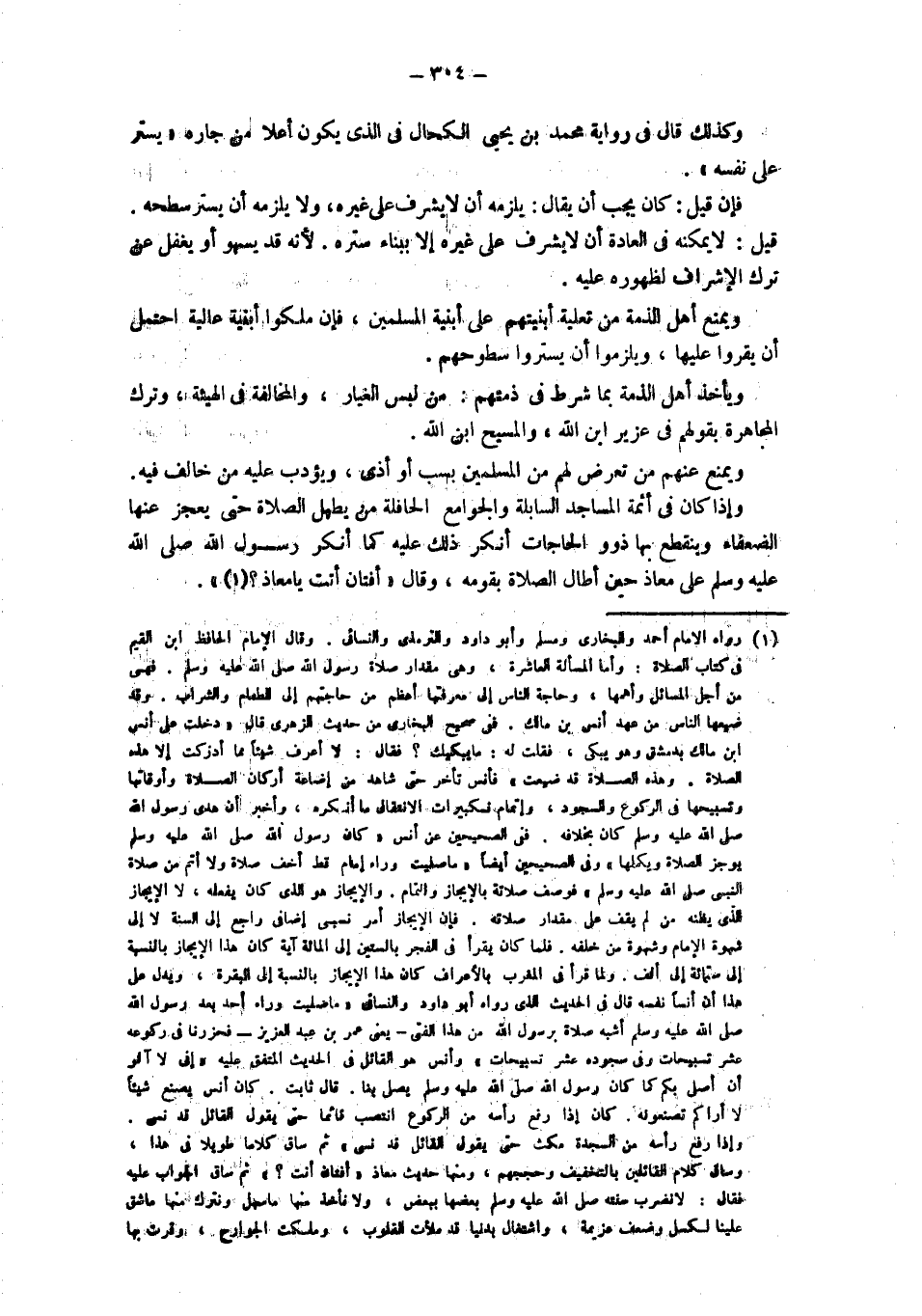 وكذلك قال في رواية محمد بن يحيى الكحال في الذي يكون أعلا من جاره " يستر على نفسه". فإن قيل: كان يجب أن يقال: يلزمه أن لايشرف على غيره، ولا يلزمه أن يستر سطحه. قيل: لا يمكنه في العادة أن لايشرف على غيره إلا ببناء ستره، لأنه قد يسهو أو يغفل عن ترك الإشراف لظهوره عليه. وَيُمْنَعُ أَهْلُ الذِّمَّةِ مِنْ تَعْلِيَةِ أَبْنِيَتِهِمْ عَلَى أبنية المسلمين، فإن ملكوا أبنية عالية احتمل أن يقروا عليها، ويلزموا أن يستروا سطوحهم. ويأخذ أهل الذمة بما شرط فِي ذِمَّتِهِمْ، مِنْ لُبْسِ الْغِيَارِ، وَالْمُخَالَفَةِ فِي الهيئة، وترك المجاهرة بقولهم في عزيز ابن الله، والمسيح ابن الله. وَيُمْنَعُ عَنْهُمْ مَنْ تَعَرَّضَ لَهُمْ مِنْ الْمُسْلِمِينَ بِسَبٍّ أَوْ أَذًى، وَيُؤَدَّبُ عَلَيْهِ مَنْ خَالَفَ فِيهِ. وَإِذَا كَانَ فِي أَئِمَّةِ الْمَسَاجِدِ السَّابِلَةِ والجوامع الحافلة مَنْ يُطِيلُ الصَّلَاةَ حَتَّى يَعْجِزَ عَنْهَا الضُّعَفَاءُ وَيَنْقَطِعَ بِهَا ذَوُو الْحَاجَاتِ أَنْكَرَ ذَلِكَ عَلَيْهِ كما أنكر رَسُولُ اللَّهِ - صَلَّى اللَّهُ عَلَيْهِ وَسَلَّمَ - عَلَى معاذ حِينَ أَطَالَ الصَّلَاةَ بِقَوْمِهِ، وَقَالَ: " أَفَتَّانٌ أَنْتَ يا معاذ؟ ".