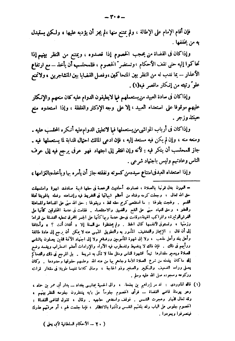 فإن أقام الإمام عَلَى الْإِطَالَةِ، وَلَمْ يَمْتَنِعْ مِنْهَا، لَمْ يَجُزْ أَنْ يُؤَدِّبَهُ عَلَيْهَا، وَلَكِنْ يَسْتَبْدِلُ بِهِ مَنْ يخففها. وإذا كان في القضاة يحجب الْخُصُومَ إذَا قَصَدُوهُ، وَيَمْتَنِعُ مِنْ النَّظَرِ بَيْنَهُمْ إذا تحاكموا إليه حتى تقف الأحكام، وتستضر الخصوم، فللمحتسب أن يأخذ - مَعَ ارْتِفَاعِ الْأَعْذَارِ- بِمَا نُدِبَ لَهُ مِنْ النظر بين المتحاكمين وفصل القضايا بين المتشاجرين، ولا تمنع عُلُوُّ رُتْبَتِهِ مِنْ إنْكَارِ مَا قَصَّرَ فِيهِ. وَإِذَا كَانَ فِي سَادَةِ الْعَبِيدِ مَنْ يَسْتَعْمِلُهُمْ فِيمَا لَا يُطِيقُونَ الدَّوَامَ عَلَيْهِ كَانَ مَنْعُهُمْ والإنكار عليهم موقوفا على استعداء العبيد، إلا على وجه الإنكار والغلظة، وإذا استعدوه منع حينئذ وزجر. وإذا كان في أرباب المواشي من يستعملها فيما لا تطيق الدَّوَامَ عَلَيْهِ أَنْكَرَهُ الْمُحْتَسِبُ عَلَيْهِ. وَمَنَعَهُ مِنْهُ، وَإِنْ لَمْ يَكُنْ فِيهِ مُسْتَعِدٌّ إلَيْهِ، فَإِنْ ادعى المالك احتمال الدابة لما يستعملها فيه، جاز للمحتسب أن ينكر فِيهِ؛ لِأَنَّهُ وَإِنْ افْتَقَرَ 'إلَى اجْتِهَادٍ فَهُوَ عرفي يرجع فيه إلى عرف الناس وعادتهم وليس باجتهاد شرعي. وَإِذَا اسْتَعْدَاهُ الْعَبْدُ فِي امْتِنَاعِ سَيِّدِهِ مِنْ كسوته ونفقته جاز أن يأمره بها ويأخذه بالتزامها.