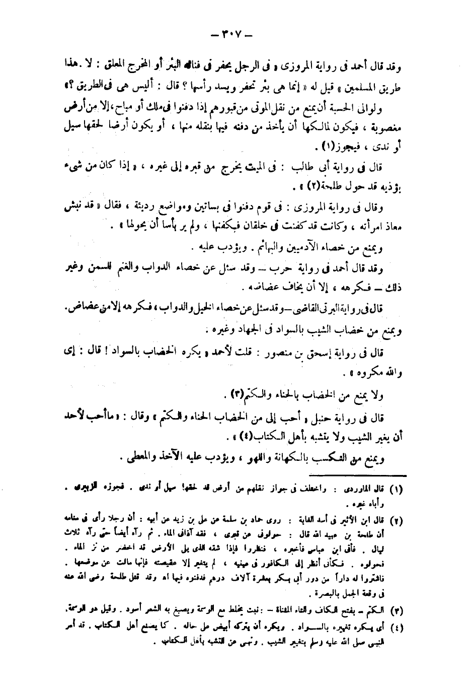 وقال في رواية المروزي " في قو دفنوا في بساتين ومواضع رديئة، فقال " قد نبش معاذ امرأته، وكانت قد كفنت في خلقان فكفنها، ولم ير بأسا أن يحولها". وَيَمْنَعُ مِنْ خِصَاءِ الْآدَمِيِّينَ وَالْبَهَائِمِ، وَيُؤَدِّبُ عَلَيْهِ. وقد قال أحمد في رواية حرب - وقد سئل عن خصاء الدواب والغنم للسمن وغير ذلك - فكرهه، إلا أن يخاف عضاضه. قال في رواية البرتي القاضي - وقد سئل عن خصاء الخيل والدواب فكرهه، إلا من عضاض. ويمنع من خضاب الشيب بالسواد في الجهاد وغيره. قال في رواية إسحاق بن منصور: قلت لأحمد: " يكره الخضاب بالسواد؟ قال: إي والله مكروه". ولا يمنع من الخضاب بالحناء والكتم قال في رواية حنبل: " أحب إلى من الخضاب الحناء والكتم " وقال: " ما أحب لأحد أن يغير الشيب ولا يتشبه بأهل الكتاب". ويمنع مِنْ التَّكَسُّبِ بِالْكَهَانَةِ وَاللَّهْوِ، وَيُؤَدِّبُ عَلَيْهِ الْآخِذَ والمعطي.