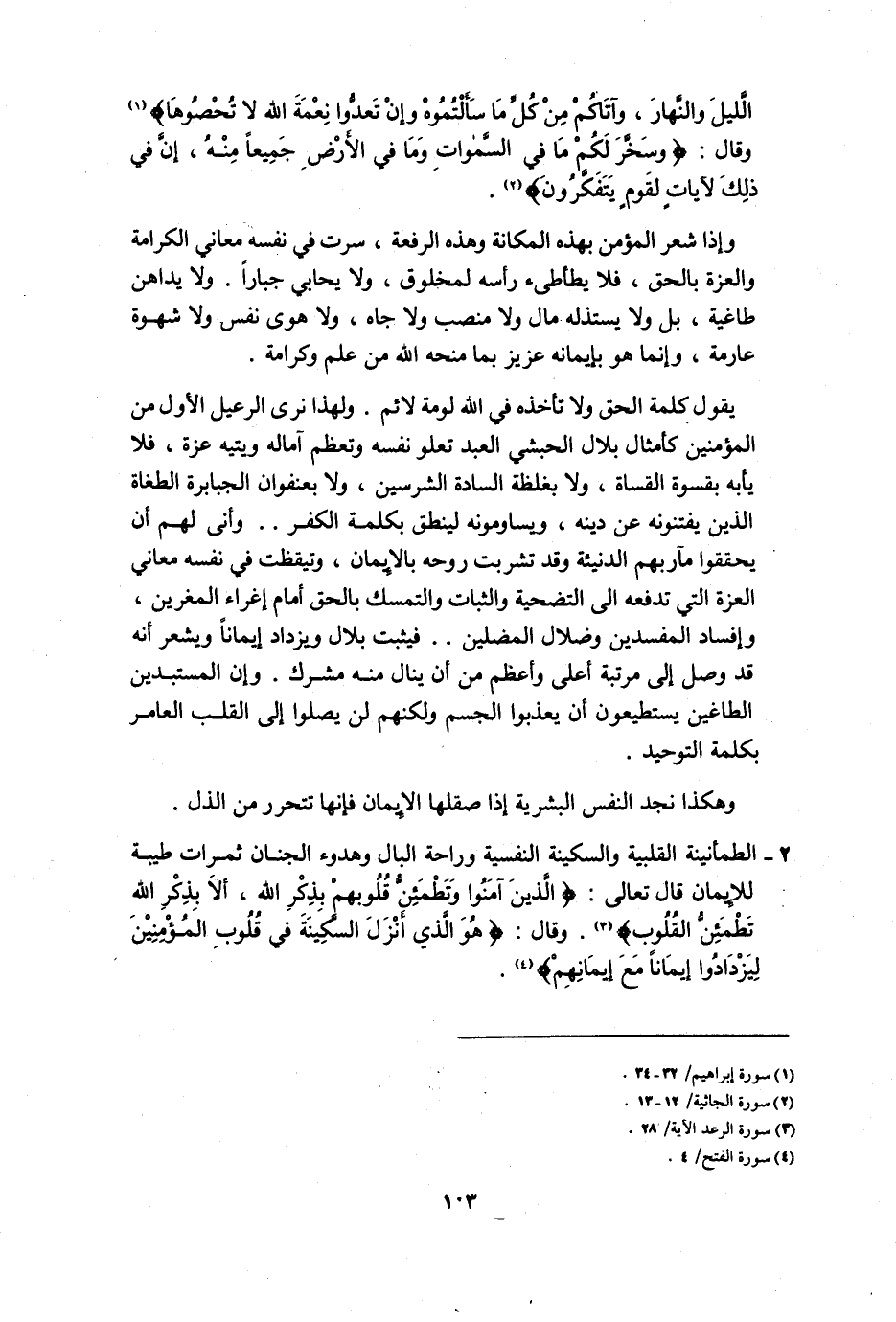 يقول كلمة الحق ولا تأخذه في الله لومة لائم. ولهذا نرى الرعيل الأول من المؤمنين كأمثال بلال الحبشي العبد تعلو نفسه وتعظم آماله ويتيه عزة، فلا يأبه بقسوة القساة، ولا بغلظة السادة الشرسين، ولا بعنفوان الجبابرة الطغاة الذي يفتنونه عن دينه، ويساومونه لينطق بكلمة الكفر.. وأنى لهم أن يحققوا مآربهم الدنيئة وقد تشربت روحه بالإيمان، وتيقظت في نفسه معاني العزة التي تدفعه إلى التضحية والثبات والتمسك بالحق أمام إغراء المغرين، وإفساد المفسدين وضلال المضلين.. فيثبت بلال ويزداد إيمانًا ويشعر أنه قد وصل إلى مرتبة أعلى وأعظم من أن ينال منه مشرك. وإن المستبدين الطاغين يستطيعون أن يعذبوا الجسم ولكنهم لن يصلوا إلى القلب العامر بكلمة التوحيد.