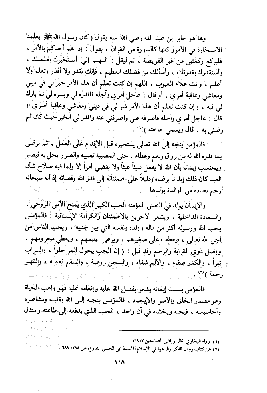 وها هو جابر بن عبد الله -رضي الله عنه- يقول "كان رسول الله -صلى الله عليه وسلم- يعلمنا الاستخارة في الأمور كلها كالسورة من القرآن، يقول: "إذا هم أحدكم بالأمر، فليركع ركعتين من غير الفريضة، ثم ليقل: اللهم إني أستخيرك بعلمك، وأستقدرك بقدرتك، وأسألك من فضلك العظيم، فإنك تقدر ولا أقدر وتعلم ولا أعلم، وأنت علام الغيوب، اللهم إن كنت تعلم أن هذا الأمر خير لي في ديني ومعاشي وعاقبة أمري. أو قال: عاجل أمري وآجله فاقدره لي ويسره لي ثم بارك لي فيه، وإن كنت تعلم أن هذا الأمر شر لي في ديني ومعاشي وعاقبة أمري أو قال: عاجل أمري وآجله فاصرفه عني واصرفني عنه واقدر لي الخير حيث كان ثم رَضِّني به. قال ويسمي حاجته" 1.