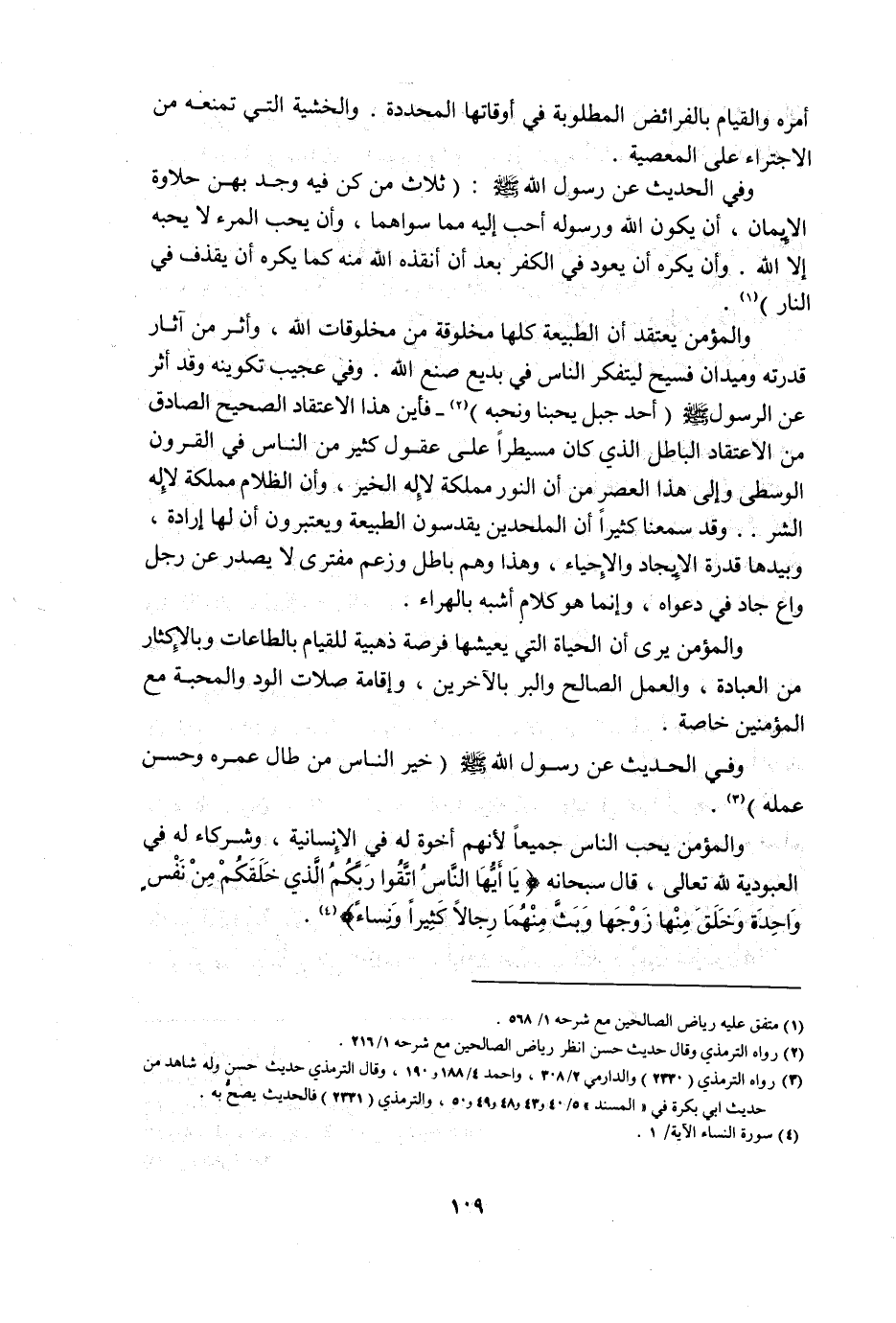 والمؤمن يعتقد أن الطبيعة كلها مخلوقة من مخلوقات الله، وأثر من آثار قدرته وميدان فسيح ليتفكر الناس في بديع صنع الله. وفي عجيب تكوينه وقد أثر عن الرسول, صلى الله عليه وسلم: "أحد جبل يحبنا ونحبه" 2 , فأين هذا الاعتقاد الصحيح الصادق من الاعتقاد الباطل الذي كان مسيطرًا على عقول كثير من الناس في القرون الوسطى وإلى هذا العصر من أن النور مملكة لإله الخير، وأن الظلام مملكة لإله الشر.. وقد سمعنا كثيرًا أن الملحدين يقدسون الطبيعة ويعتبرون أن لها إرادة، وبيدها قدرة الإيجاد والإحياء، وهذا وهم باطل وزعم مفترى لا يصدر عن رجل واع جاد في دعواه، وإنما هو كلام أشبه بالهراء.