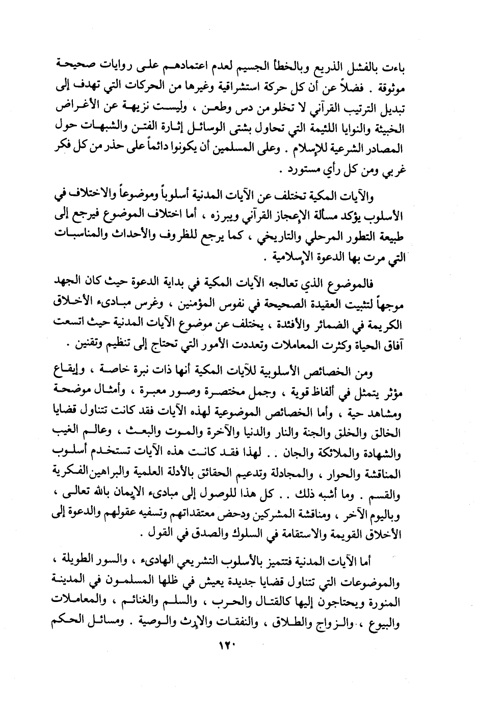والآيات المكية تختلف عن الآيات المدنية أسلوبًا وموضوعًا والاختلاف في الأسلوب يؤكد مسألة الإعجاز القرآني ويبرزه، أما اختلاف الموضوع فيرجع إلى طبيعة التطور المرحلي والتاريخي، كما يرجع للظروف والأحداث والمناسبات التي مرت بها الدعوة الإسلامية.