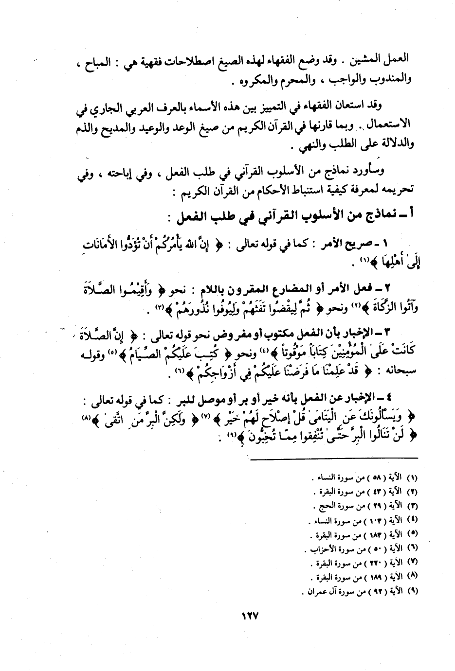 وسأورد نماذج من الأسلوب القرآني في طلب الفعل، وفي إباحته، وفي تحريمه لمعرفة كيفية استنباط الأحكام من القرآن الكريم: