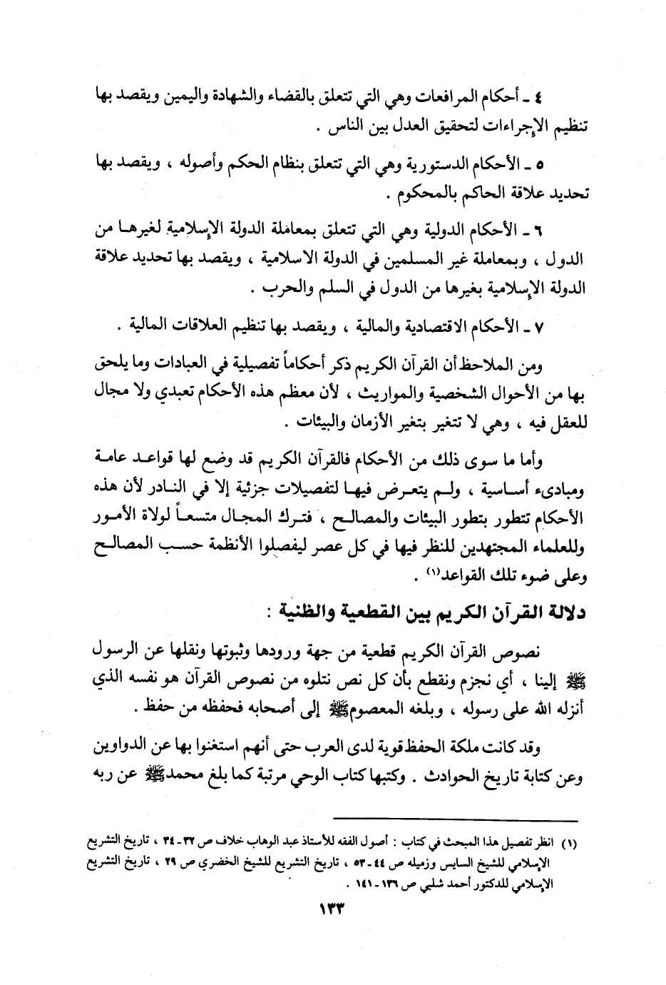 وأما ما سوى ذلك من الأحكام فالقرآن الكريم قد وضع لها قواعد عامة ومبادئ أساسية، ولم يتعرض فيها لتفصيلات جزئية إلا في النادر لأن هذه الأحكام تتطور بتطور البيئات والمصالح، فترك المجال متسعًا لولاة الأمور وللعلماء المجتهدين للنظر فيها في كل عصر ليفصلوا الأنظمة حسب المصالح وعلى ضوء تلك القواعد1.