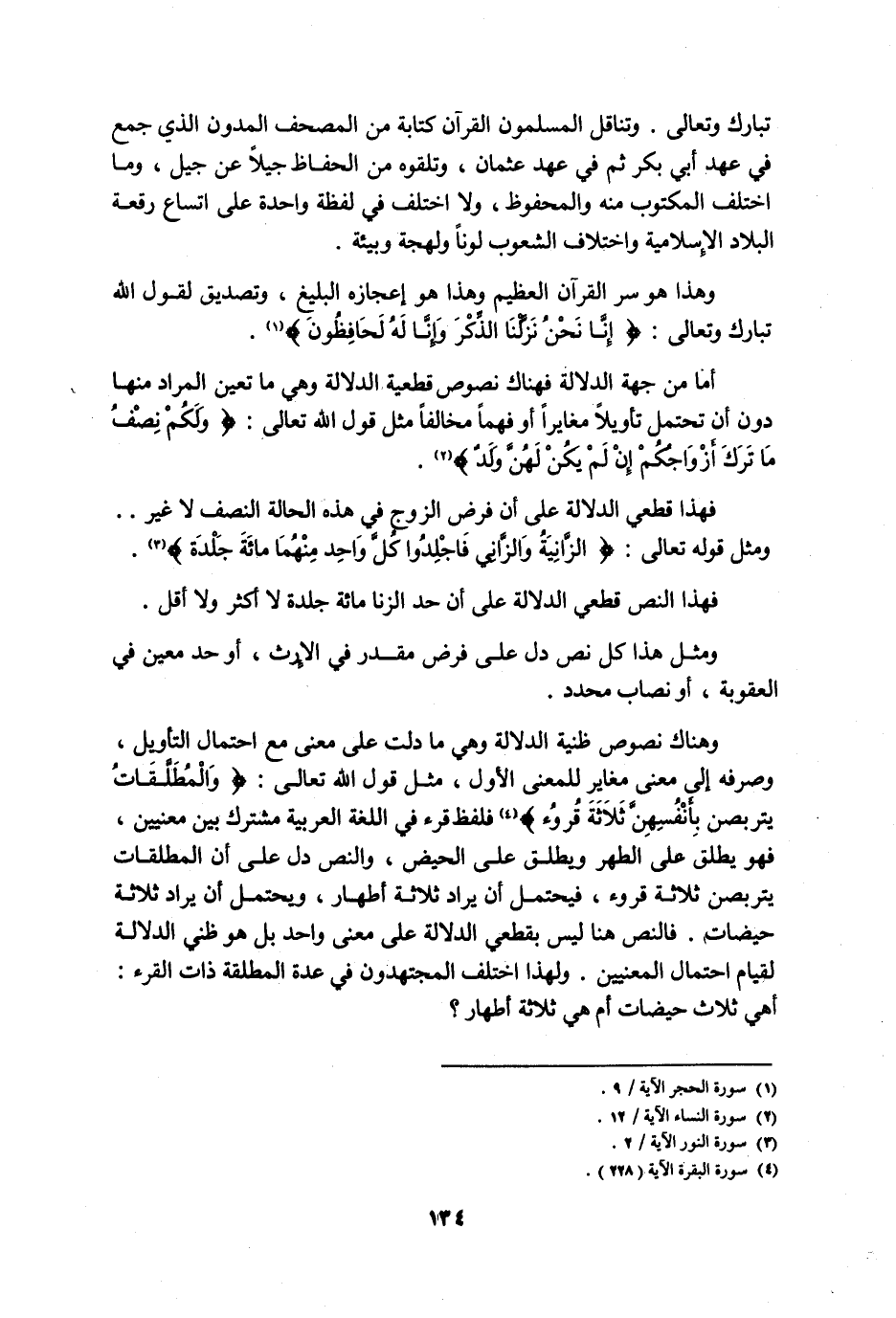 وهناك نصوص ظنية الدلالة وهي ما دلت على معنى مع احتمال التأويل، وصرفه إلى معنى مغاير للمعنى الأول، مثل قول الله تعالى: {وَالْمُطَلَّقَاتُ يَتَرَبَّصْنَ بِأَنفُسِهِنَّ ثَلاثَةَ قُرُوءٍ} 4, فلفظ قرء في اللغة العربية مشترك بين معنيين، فهو يطلق على الطهر ويطلق على الحيض، والنص دل على أن المطلقات يتربصن ثلاثة قروء، فيحتمل أن يراد ثلاثة أطهار، ويحتمل أن يراد ثلاثة حيضات. فالنص هنا ليس بقطعي الدلالة على معنى واحد بل هو ظني الدلالة لقيام احتمال المعنيين. ولهذا اختلف المجتهدون في عدة المطلقة ذات القرء: أهي ثلاث حيضات أم هي ثلاثة أطهار؟