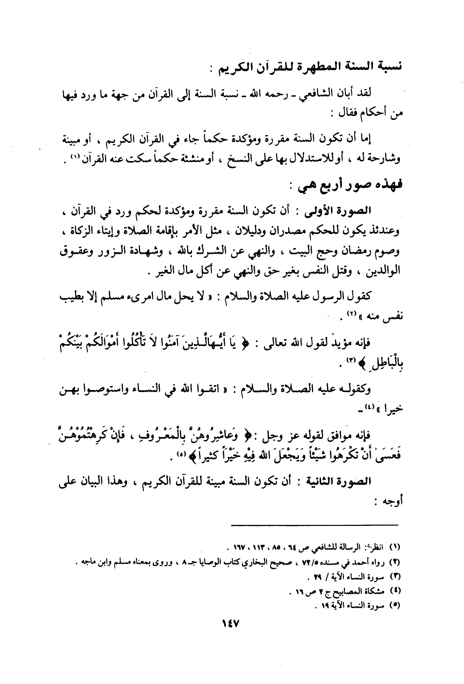 الصورة الأولى: أن تكون السنة مقررة ومؤكدة لحكم ورد في القرآن، وعندئذ يكون للحكم مصدران ودليلان، مثل الأمر بإقامة الصلاة وإيتاءالزكاة، وصوم رمضان وحج البيت، والنهي عن الشرك بالله، وشهادة الزور وعقوق الوالدين، وقتل النفس بغير حق والنهي عن أكل مال الغير.
