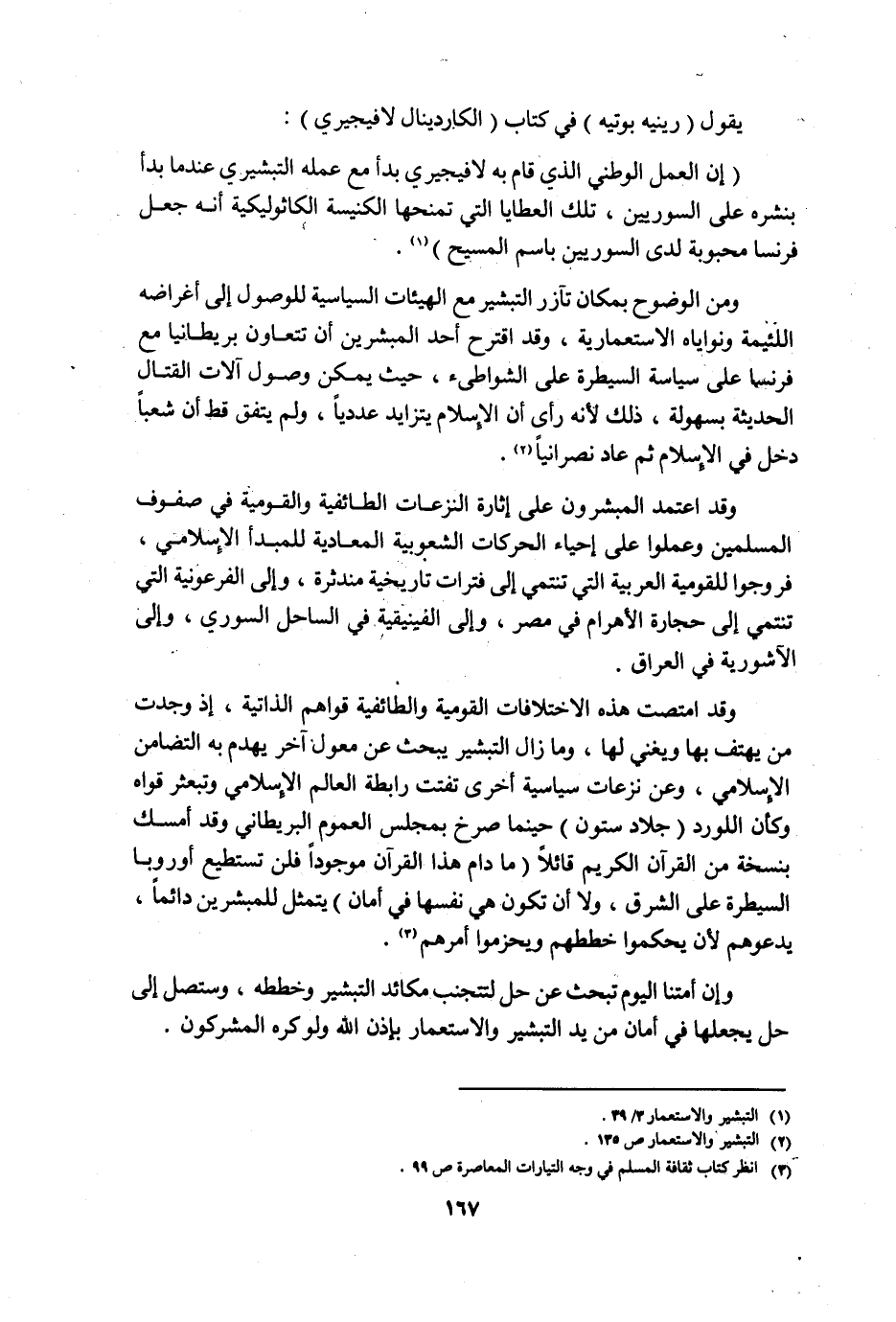 وقد امتصت هذه الاختلافات القومية والطائفية قواهم الذاتية، إذ وجدت من يهتف بها ويغني لها، وما زال التبشير يبحث عن معول آخر يهدم به التضامن الإسلامي، وعن نزعات سياسية أخرى تفتت رابطة العالم الإسلامي وتبعثر قواه وكأن اللورد "جلاد ستون" حينما صرخ بمجلس العموم البريطاني وقد أمسك بنسخة من القرآن الكريم قائلًا "ما دام هذا القرآن موجودًا فلن تستطيع أوروبا السيطرة على الشرق، ولا أن تكون هي نفسها في أمان" يتمثل للمبشرين دائمًا، يدعوهم لأن يحكموا خططهم ويحزموا أمرهم3.