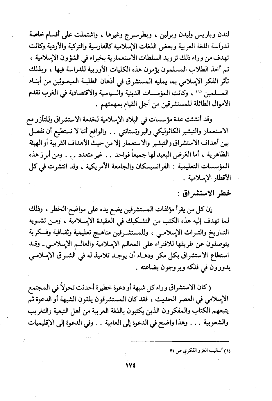 إن كل من يقرأ مؤلفات المستشرقين يضع يده على مواضع الخطر، وذلك لما تهدف إليه هذه الكتب من التشكيك في العقيدة الإسلامية، ومن تشويه التاريخ والتراث الإسلامي، وللمستشرقين مناهج تعليمية وثقافية وفكرية يتوصلون عن طريقها للافتراء على المعالم الإسلامية والعالم الإسلامي, وقد استطاع الاستشراق بكل مكر ودهاء أن يوجد تلاميذ له في الشرق الإسلامي يدورون في فلكه ويروجون بضاعته.