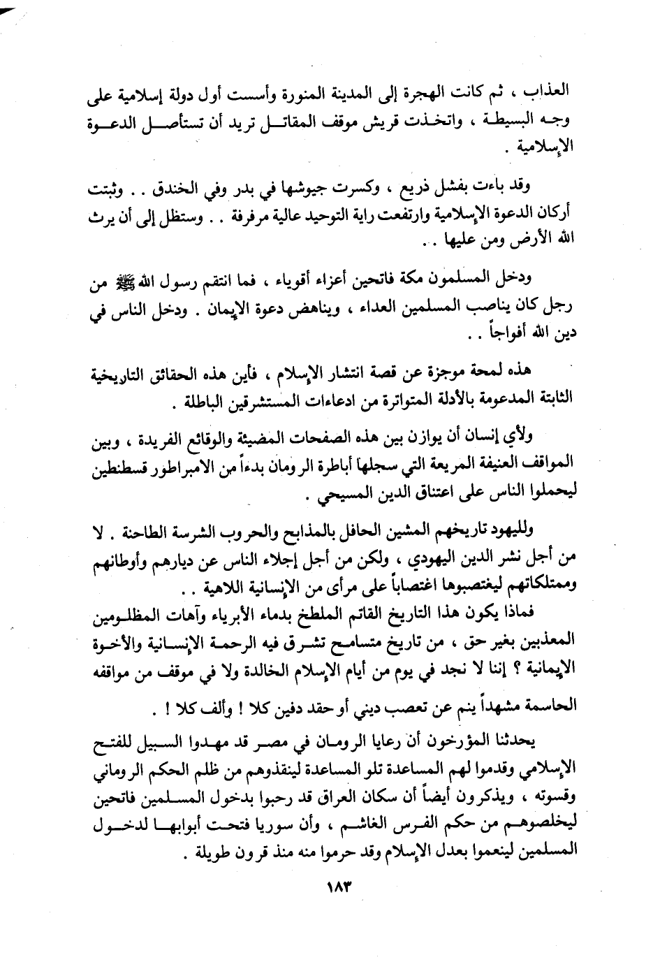 وكان للمسلمين منهج واضح في الدعوة إلى التوحيد، هذا المنهج يتضح لكل ذي بصيرة إذا قرأ الكتب التي أرسلها رسول الله -صلى الله عليه وسلم- إلى ملوك أهل الكتاب، فقد كان -صلى الله عليه وسلم- يخيرهم بين أن يدخلوا في الإسلام أو يظلوا على دينهم ويدفعوا الجزية، وإذا قبلوا دفع الجزية كان على المسلمين حمايتهم، وتترك لهم الحرية في إقامة شعائرهم الدينية. والدليل على ذلك معاملة الرسول -صلى الله عليه وسلم- لوفد بني تغلب حينما قدموا إلى المدينة وكان منهم وثنيون أعلنوا إسلامهم، ومنهم مسيحيون ظلوا على مسيحيتهم، ومع انتشار الإسلام وتقدمه فقد ظل في هذه القبيلة عدد كبير من المسيحيين، ولما جاء عمر بن الخطاب حذر من الضغط عليهم بأية وسيلة، وأمر أن تكون لهم الحرية التامة في ممارسة شعائرهم الدينية، ولكنه اشترط عليهم أيضًا ألا يحولوا بين أي فرد منهم وبين الإسلام إذا رغب أن يكون مسلمًا، ومن أسلم منهم فإن أطفاله مسلمون لا يعمدون.. وقد آثرت هذه القبيلة أن تدفع الزكاة بدلًا من الجزية وتدخل في دين الله الذي حظيت في حماه بالحرية والكرامة الإنسانية.