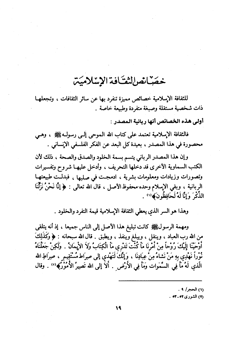 فالثقافة الإسلامية تعتمد على كتاب الله الموحى إلى رسوله -صلى الله عليه وسلم- وهي محصورة في هذا المصدر، بعيدة كل البعد عن الفكر الفلسفي الإنساني.