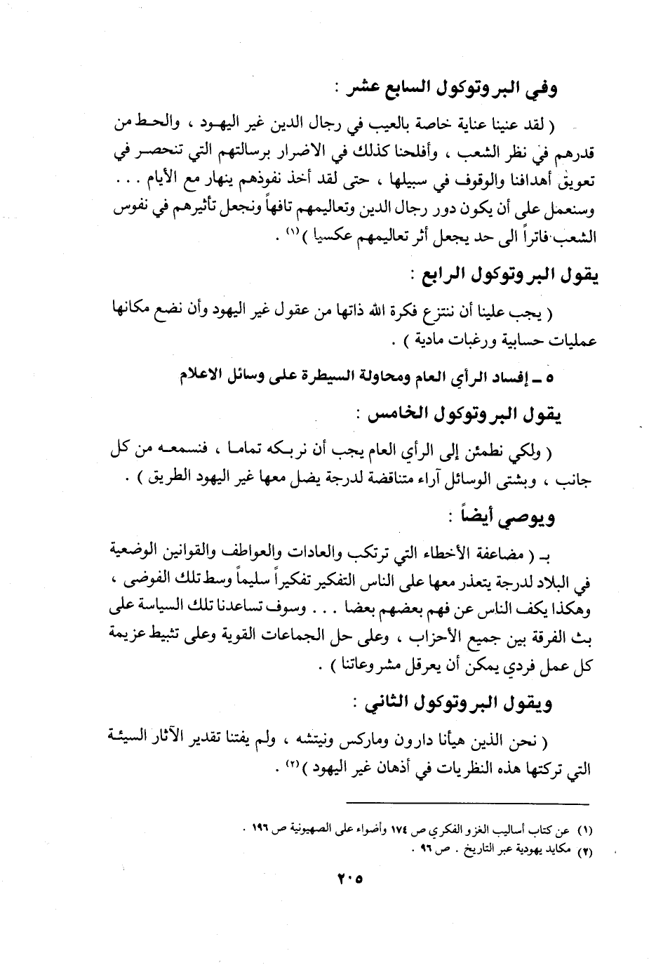 "لقد عنينا عناية خاصة بالعيب في رجال الدين غير اليهود، والحط من قدرهم في نظر الشعب، وأفلحنا كذلك في الإضرار برسالتهم التي تنحصر في تعويق أهدافنا والوقوف في سبيلها، حتى لقد أخذ نفوذهم ينهار مع الأيام ... وسنعمل على أن يكون دور رجال الدين وتعاليمهم تافهًا ونجعل تأثيرهم في نفوس الشعب فاترًا إلى حد يجعل أثر تعاليمهم عكسيًّا"1.