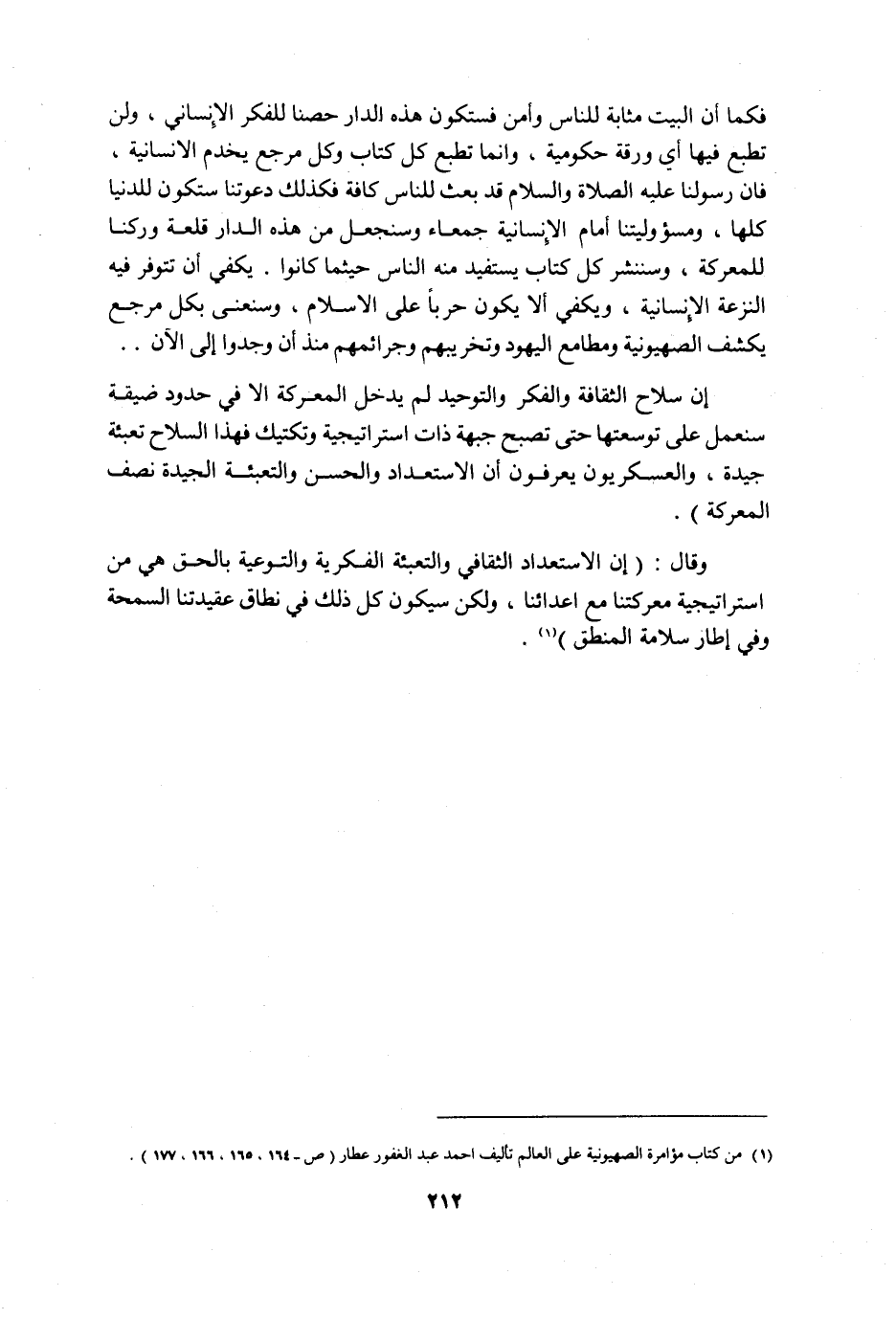 إن سلاح الثقافة والفكر والتوحيد لم يدخل المعركة إلا في حدود ضيقة سنعمل على توسعتها حتى تصبح جبهة ذات استراتيجية وتكتيك فهذا السلاح تعبئة جيدة، والعسكريون يعرفون أن الاستعداد والحسن والتعبئة الجيدة نصف المعركة".