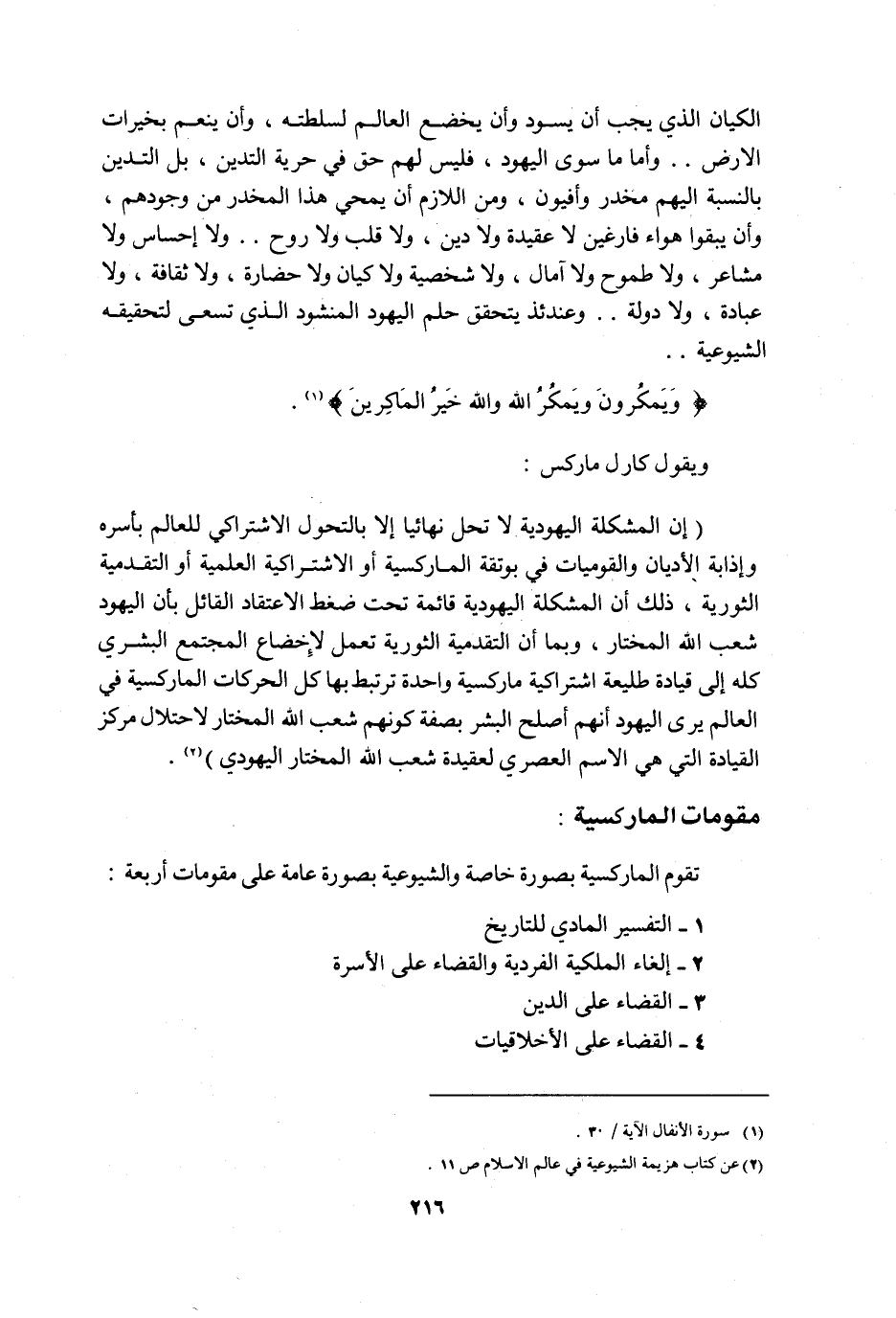 الكيان الذي يجب أن يسود وأن يخضع العالم لسلطته، وأن ينعم بخيرات الأرض.. وأما ما سوى اليهود، فليس لهم حق في حرية التدين، بل التدين بالنسبة إليهم مخدر وأفيون، ومن اللازم أن يمحى هذا المخدر من وجودهم، وأن يبقوا هواء فارغين لا عقيدة ولا دين، ولا قلب ولا روح.. ولا إحساس ولا مشاعر، ولا طموح ولا آمال، ولا شخصية ولا كيان ولا حضارة، ولا ثقافة، ولا عبادة، ولا دولة.. وعندئذ يتحقق حلم اليهود المنشود الذي تسعى لتحقيقه الشيوعية. {وَيَمْكُرُونَ وَيَمْكُرُ اللَّهُ وَاللَّهُ خَيْرُ الْمَاكِرِينَ} 1.