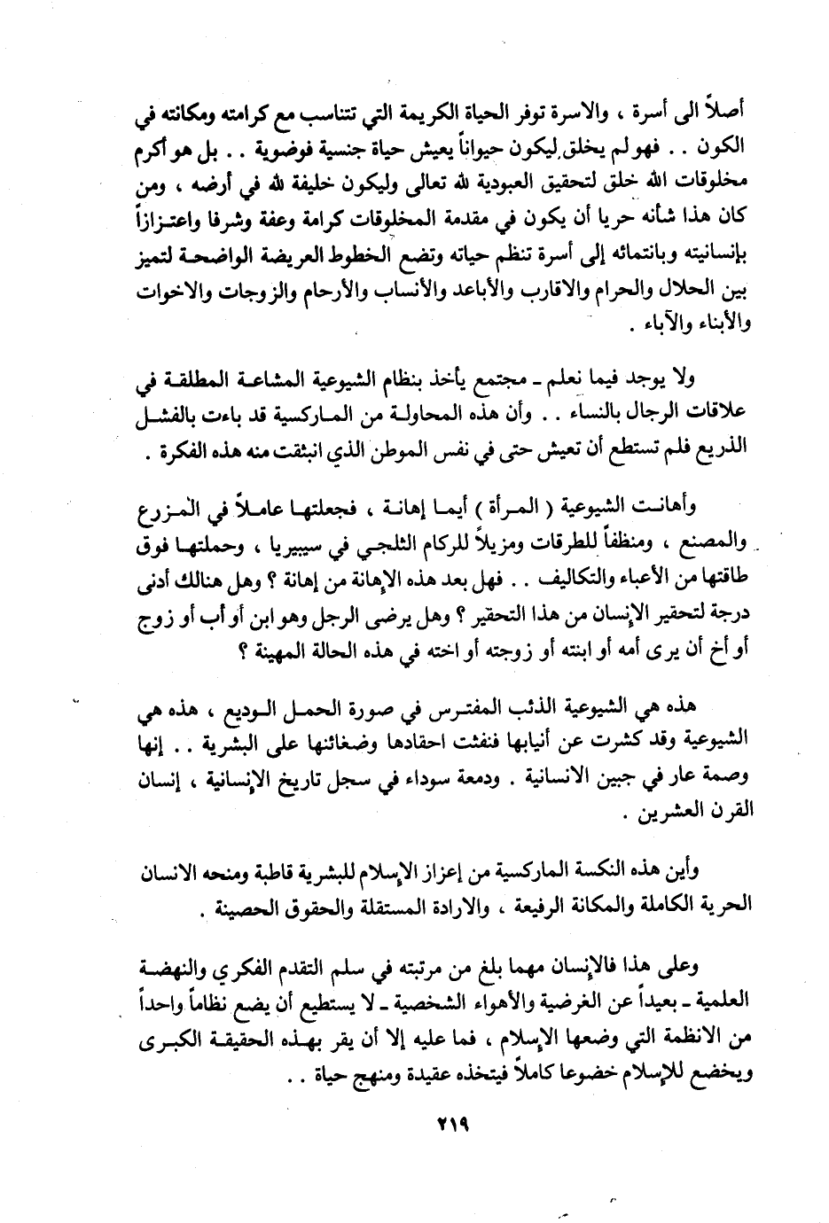 وأين هذه النكسة الماركسية من إعزاز الإسلام للبشرية قاطبة ومنحه الإنسان الحرية الكاملة والمكانة الرفيعة، والإرادة المستقلة والحقوق الحصينة.