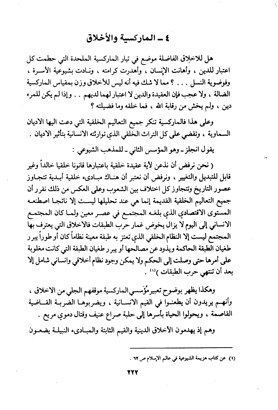 هل للأخلاق الفاضلة موضع في تيار الماركسية الملحدة التي حطمت كل اعتبار للدين، وأهانت الإنسان، وأهدرت كرامته، ونادت بشيوعية الأسرة، وفوضوية النسل ... ؟ مما لا شك فيه أنه ليس للأخلاق وزن بمقياس الماركسية الضالة، ولا عجب فإن العقيدة والدين لا اعتبار لهما لديهم.. وإذا لم يكن للمرء دين، ولم يخش من رقابة الله، فما خلقه وما فضيلته؟
