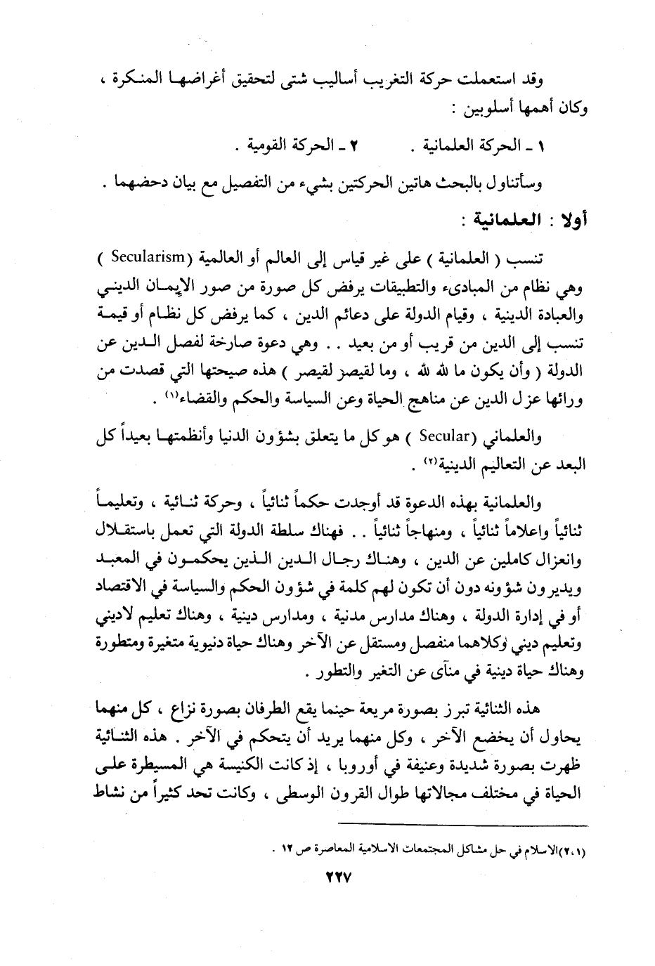والعلمانية بهذه الدعوة قد أوجدت حكمًا ثنائيًّا، وحركة ثنائية، وتعليمًا ثنائيًّا وإعلامًا ثنائيًّا، ومنهاجًا ثنائيًّا.. فهناك سلطة الدولة التي تعمل باستقلال وانعزال كاملين عن الدين، وهناك رجال الدين الذين يحكمون في المعبد ويديرون شئونه دون أن تكون لهم كلمة في شئون الحكم والسياسة في الاقتصاد أو في إدارة الدولة، وهناك مدارس مدنية، ومدارس دينية، وهناك تعليم لا ديني وتعليم ديني وكلاهما منفصل ومستقل عن الآخر وهناك حياة دنيوية متغيرة ومتطورة وهناك حياة دينية في منأى عن التغير والتطور.