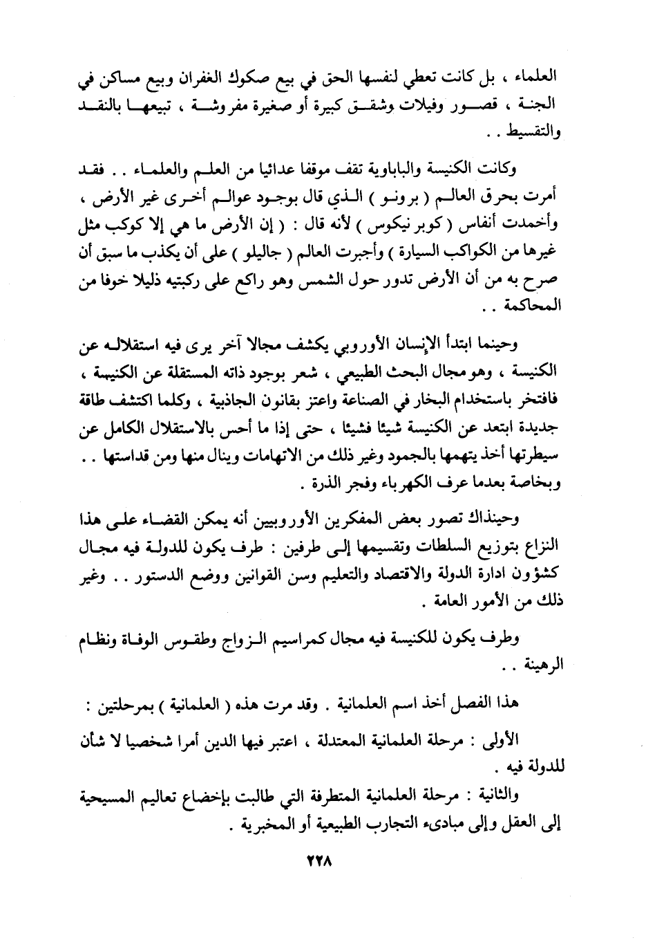 وحينما ابتدأ الإنسان الأوروبي يكشف مجالًا آخر يرى فيه استقلاله عن الكنيسة، وهو مجال البحث الطبيعي، شعر بوجود ذاته المستقلة عن الكنيسة، فافتخر باستخدام البخار في الصناعة واعتز بقانون الجاذبية، وكلما اكتشف طاقة جديدة ابتعد عن الكنيسة شيئًا فشيئًا، حتى إذا ما أحس بالاستقلال الكامل عن سيطرتها أخذ يتهمها بالجمود وغير ذلك من الاتهامات وينال منها ومن قداستها.. وبخاصة بعدما عرف الكهرباء وفجر الذرة.