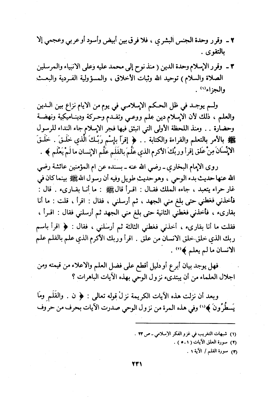 ولم يوجد في ظل الحكم الإسلامي في يوم من الأيام نزاع بين الدين والعلم، ذلك لأن الإسلام دين علم ووعي وتقدم وحركة وديناميكية ونهضة وحضارة.. ومنذ اللحظة الأولى التي انبثق فيها فجر الإسلام جاء النداء للرسول -صلى الله عليه وسلم- بالأمر بالتعلم والقراءة والكتابة: {اقْرَأْ بِاسْمِ رَبِّكَ الَّذِي خَلَقَ، خَلَقَ الإِنسَانَ مِنْ عَلَقٍ، اقْرَأْ وَرَبُّكَ الأَكْرَمُ، الَّذِي عَلَّمَ بِالْقَلَمِ، عَلَّمَ الإِنسَانَ مَا لَمْ يَعْلَمْ} .