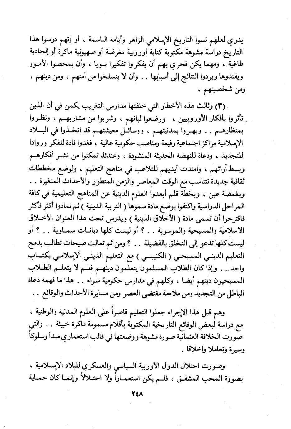 3- وثالث هذه الأخطار التي خلفتها مدارس التغريب يكمن في أن الذين تأثروا بأفكار الأوروبيين، ورضعوا لبانهم، وشربوا من مشاربهم، ونظروا بمنظارهم.. وبهروا بمدنيتهم، ووسائل معيشتهم قد اتخذوا في البلاد الإسلامية مراكز اجتماعية رفيعة ومناصب حكومية عالية، فغدوا قادة للفكر وروادًا للتجديد، ودعاة للنهضة الحديثة المنشودة، وعندئذ تمكنوا من نشر أفكارهم وبسط آرائهم، وامتدت أيديهم للتلاعب في مناهج التعليم، ولوضع مخططات ثقافية جديدة تتناسب مع الوقت المعاصر والزمن المتطور والأحداث المتغيرة.. وبغمضة عين، وبخطة قلم أبعدوا العلوم الدينية عن المناهج التعليمية في كافة المراحل الدراسية واكتفوا بوضع مادة سموها "التربية الدينية" ثم تمادوا أكثر فأكثر فاقترحوا أن تسمى مادة "الأخلاق الدينية" ويدرس تحت هذا العنوان الأخلاق الإسلامية والمسيحية والموسوية..؟ أو ليست كلها ديانات سماوية..؟ أو ليست كلها تدعو إلى التخلق بالفضيلة..؟ ومن ثم تعالت صيحات تطالب بدمج التعليم الديني المسيحي "الكنيسي" مع التعليم الديني الإسلامي بكتاب واحد.. وإذا كان الطلاب المسلمون يتعلمون دينهم فلم لا يتعلم الطلاب المسيحيون دينهم أيضًا، وكلهم في مدارس حكومية سواء.. هذا ما فهمه دعاة الباطل من التجديد ومن ملاءمة مقتضى العصر ومن مسايرة الأحداث والوقائع..