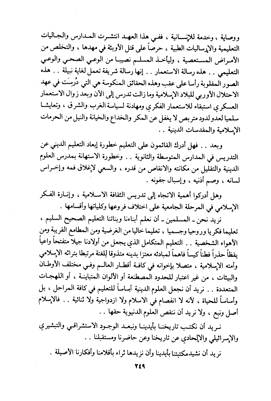 نريد -نحن المسلمين- أن نعلم أبناءنا وبناتنا التعليم الصحيح السليم، تعليمًا فكريًّا وروحيًّا وجسميًّا، تعليمًا خاليًا من الغرضية ومن المطامع القريبة ومن الأهواء الشخصية.. التعليم المتكامل الذي يجعل من أولادنا جيلًا متفتحًا واعيًا يقظًا حذرًا فطنًا كيسًا فاهمًا لمبادئه معتزًّا بدينه متذوقًَا للغته مرتبطًا بتراثه الإسلامي وأمته الإسلامية، متصلًا بإخوانه في كافة أقطار العالم وفي مختلف الأوطان والبيئات، من غير اعتبار للحدود المصطنعة أو الألوان المتباينة، أو اللهجات المتعددة.. نريد أن نجعل العلوم الدينية أساسًا للتعليم في كافة المراحل، بل وأساسًا للحياة، لأنه لا انفصام في الإسلام ولا ازدواجية ولا ثنائية.. فالإسلام أصل ونبع، ولا نريد أن ننقص العلوم الدنيوية حقها..
