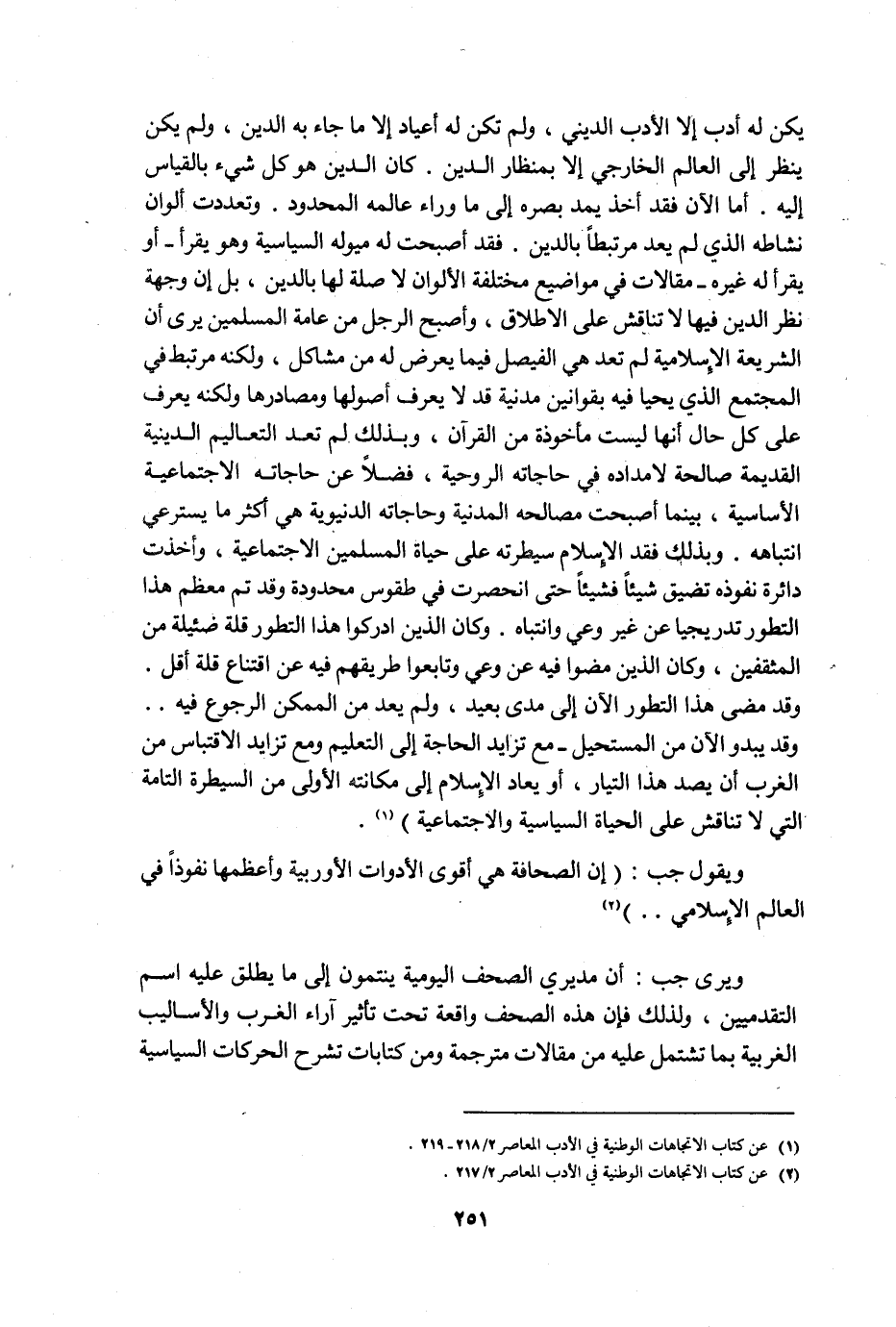 يكن له أدب إلا الأدب الديني، ولم تكن له أعياد إلا ما جاء به الدين، ولم يكن ينظر إلى العالم الخارجي إلا بمنظار الدين. كان الدين هو كل شيء بالقياس إليه. أما الآن فقد أخذ يمد بصره إلى ما وراء عالمه المحدود. وتعددت ألوان نشاطه الذي لم يعد مرتبطًا بالدين. فقد أصبحت له ميوله السياسية وهو يقرأ -أو يقرأ له غيره- مقالات في موضوعات مختلفة الألوان لا صلة لها بالدين، بل إن وجهة نظر الدين فيها لا تناقش على الإطلاق، وأصبح الرجل من عامة المسلمين يرى أن الشريعة الإسلامية لم تعد هي الفيصل فيما يعرض له من مشكلات، ولكنه مرتبط في المجتمع الذي يحيا فيه بقوانين مدنية قد لا يعرف أصولها ومصادرها ولكنه يعرف على كل حال أنها ليست مأخوذة من القرآن، وبذلك لم تعد التعاليم الدينية القديمة صالحة لإمداده في حاجاته الروحية، فضلًا عن حاجاته الاجتماعية الأساسية، بينما أصبحت مصالحه المدنية وحاجاته الدنيوية هي أكثر ما يسترعي انتباهه. وبذلك فقد الإسلام سيطرته على حياة المسلمين الاجتماعية، وأخذت دائرة نفوذه تضيق شيئًا فشيئًا حتى انحصرت في طقوس محدودة وقد تم معظم هذا التطور تدريجيًّا عن غير وعي وانتباه. وكان الذين أدركوا هذا التطور قلة ضئيلة من المثقفين، وكان الذين مضوا فيه عن وعي وتابعوا طريقهم فيه عن اقتناع قلة أقل. وقد مضى هذا التطور الآن إلى مدى بعيد، ولم يعد من الممكن الرجوع فيه.. وقد يبدو الآن من المستحيل -مع تزايد الحاجة إلى التعليم ومع تزايد الاقتباس من الغرب أن يصد هذا التيار، أو يعاد الإسلام إلى مكانته الأولى من السيطرة التامة التي لا تناقش على الحياة السياسية والاجتماعية"1.