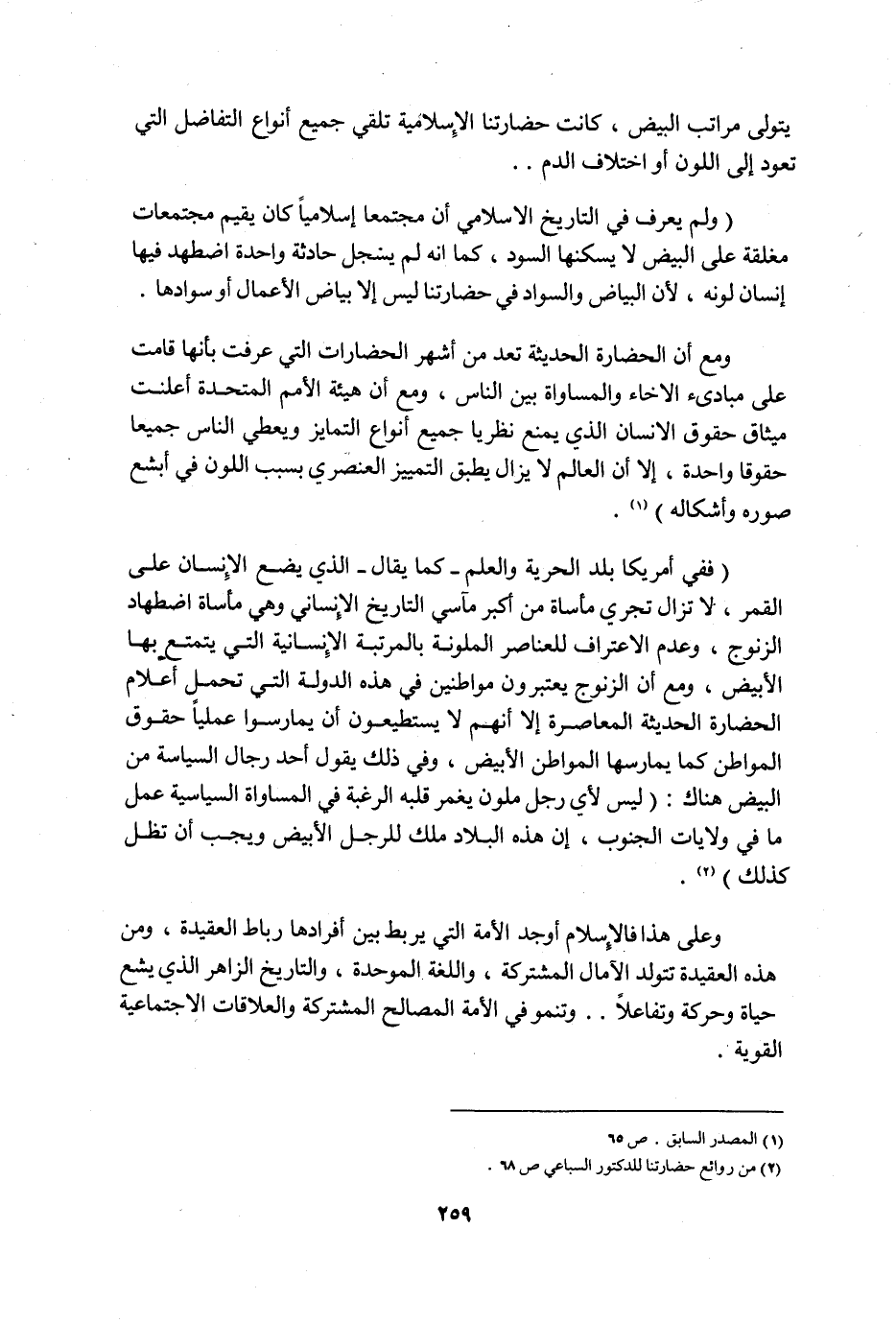 "ولم يعرف في التاريخ الإسلامي أن مجتمعًا إسلاميًّا كان يقيم مجتمعات مغلقة على البيض لا يسكنها السود، كما أنه لم يسجل حادثة واحدة اضطهد فيها إنسان لونه، لأن البياض والسواد في حضارتنا ليس إلا بياض الأعمال أو سوادها.