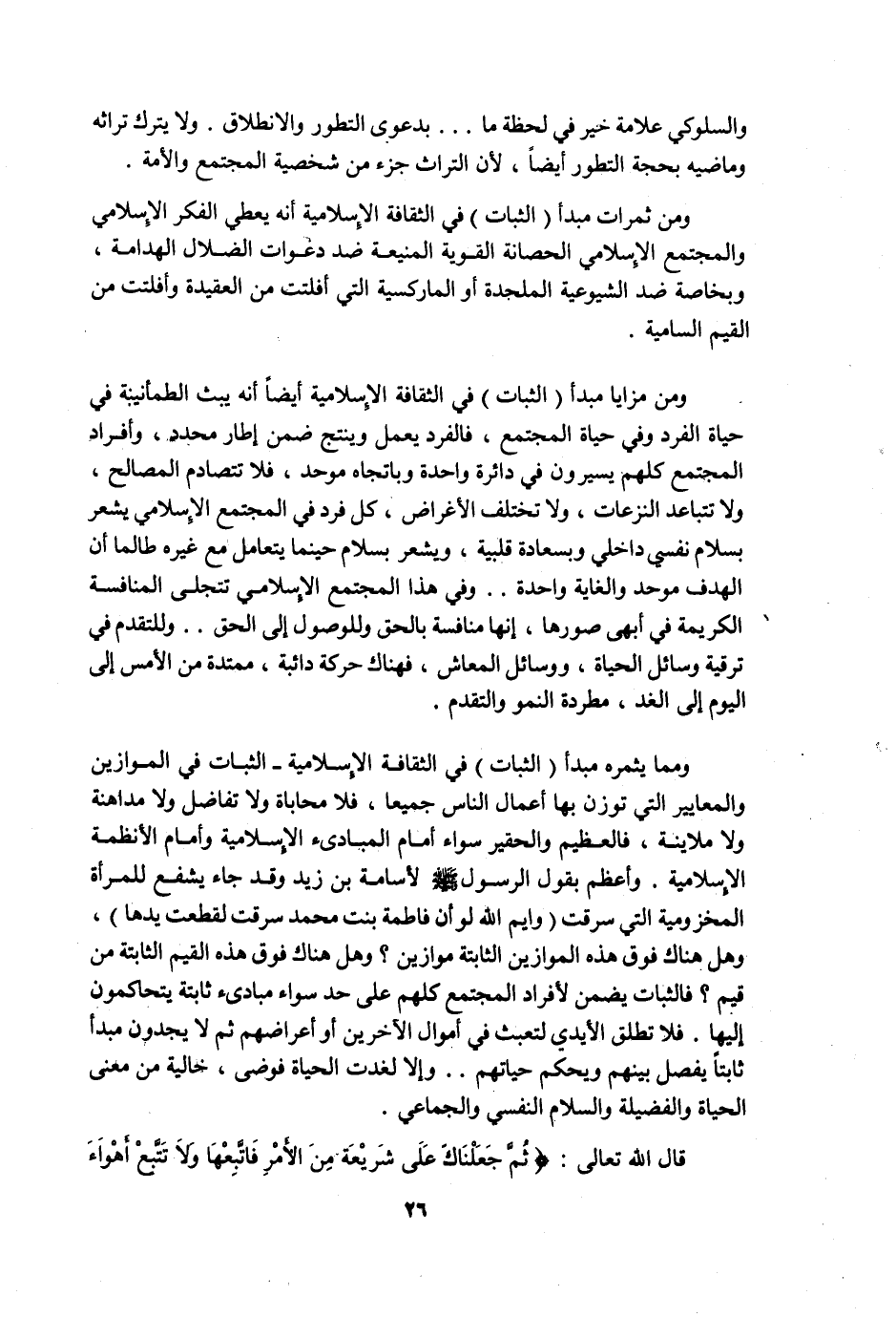 ومما يثمره مبدأ "الثبات" في الثقافة الإسلامية -الثبات في الموازين والمعايير التي توزن بها أعمال الناس جميعا، فلا محاباة ولا تفاضل ولا مداهنة ولا ملاينة، فالعظيم والحقير سواء أمام المبادئ الإسلامية وأمام الأنظمة الإسلامية. وأعظم بقول الرسول -صلى الله عليه وسلم- لأسامة بن زيد وقد جاء يشفع للمرأة المخزومية التي سرقت: "وايم الله لو أن فاطمة بنت محمد سرقت لقطعت يدها"، وهل هناك فوق هذه الموازين الثابتة موازين؟ وهل هناك فوق هذه القيم الثابتة من قيم؟ فالثبات يضمن لأفراد المجتمع كلهم على حد سواء مبادئ ثابتة يتحاكمون إليها. فلا تطلق الأيدي لتعبث في أموال الآخرين أو أعراضهم ثم لا يجدون مبدأ ثابتا يفصل بينهم ويحكم حياتهم.. وإلا لغدت الحياة فوضى، خالية من معنى الحياة والفضيلة والسلام النفسي والجماعي.