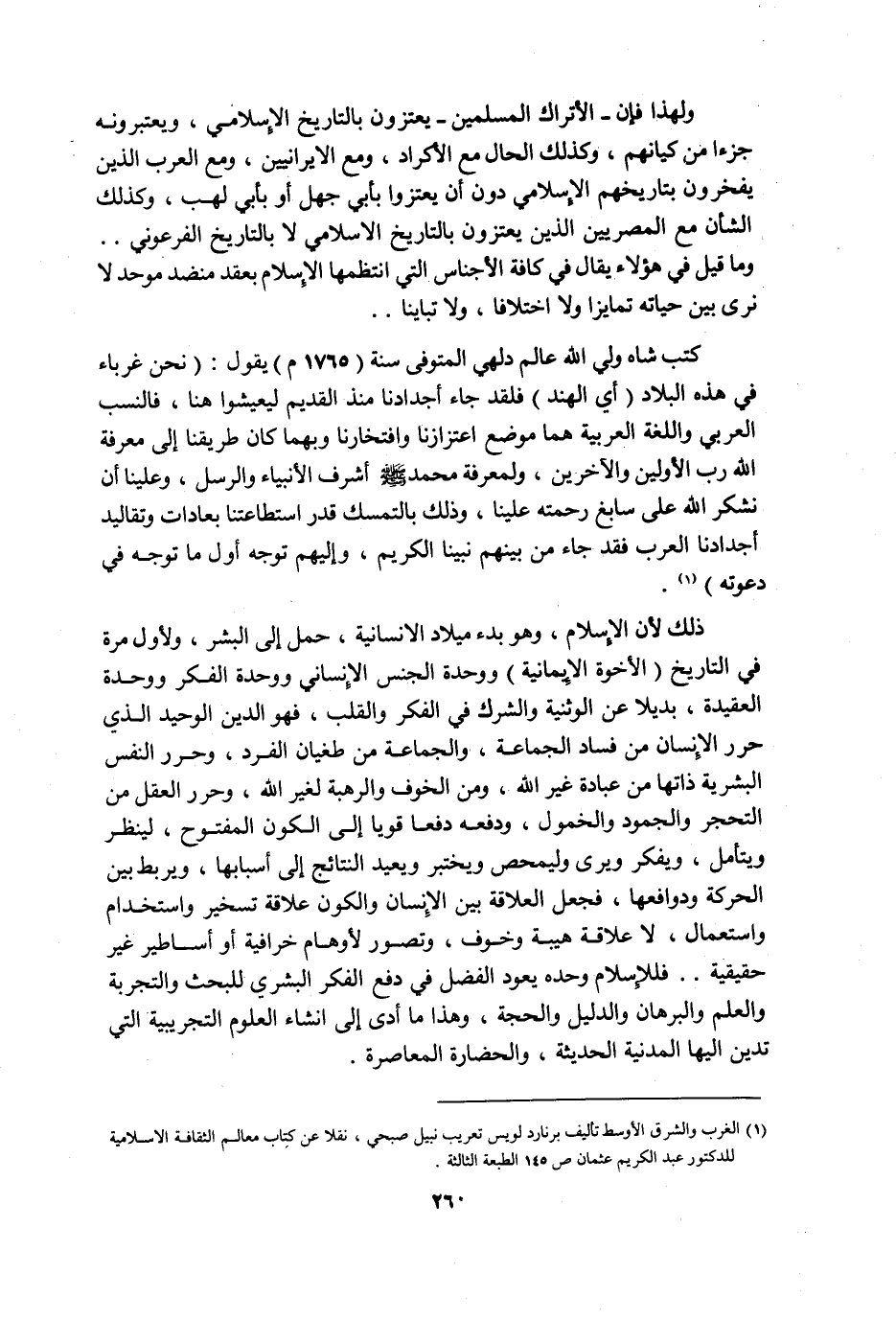 ولهذا فإن -الأتراك المسلمين- يعتزون بالتاريخ الإسلامي، ويعتبرونه جزءًا من كيانهم، وكذلك الحال مع الأكراد، ومع الإيرانيين، ومع العرب الذين يفخرون بتاريخهم الإسلامي دون أن يعتزوا بأبي جهل أو بأبي لهب، وكذلك الشأن مع المصريين الذين يعتزون بالتاريخ الإسلامي لا بالتاريخ الفرعوني.. وما قيل في هؤلاء يقال في كافة الأجناس التي انتظمها الإسلام بعقد منضد موحد لا نرى بين حياته تمايزًا ولا اختلافًا، ولا تباينًا..