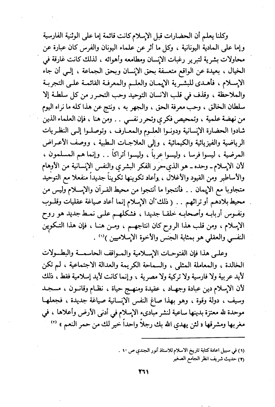 وعلى هذا فإن الفتوحات الإسلامية والمواقف الحاسمة والبطولات الخالدة، والمعاملة المثلى، والسماحة الكريمة والعدالة الاجتماعية، لم تكن لأيد عربية ولا فارسية ولا تركية ولا مصرية، وإنما كانت لأيد إسلامية فقط، ذلك لأن الإسلام دين عبادة وجهاد، عقيدة ومنهج حياة، نظام وقانون، مسجد وسيف، دولة وقوة، وهو بهذا صاغ النفس الإنسانية صياغة جديدة، فجعلها موحدة لله معتزة بدينها ساعية لنشر مبادئ الإسلام في أدنى الأرض وأعلاها، في مغربها ومشرقها: "لأن يهدي الله بك رجلًا واحدًا خير لك من حمر النعم" 2.