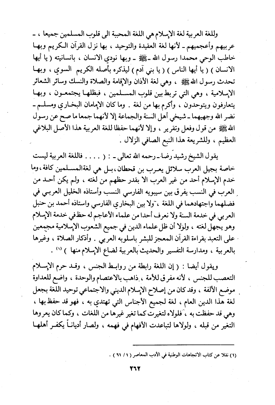 ويقول أيضًا: "إن اللغة رابطة من روابط الجنس، وقد حرم الإسلام التعصب للجنس، لأنه مفرق للأمة، ذاهب بالاعتصام والوحدة، واضع للعداوة موضع الألفة، وقد كان من إصلاح الإسلام الديني والاجتماعي توحيد اللغة بجعل لغة هذا الدين العام، لغة لجميع الأجناس التي تهتدي به، فهو قد حفظ بها، وهي قد حفظت به، فلولاه لتغيرت كما تغير غيرها من اللغات، وكما كان يعروها التغير من قبله، ولولاها لتباعدت الأفهام في فهمه، ولصار أديانًا يكفر أهلها