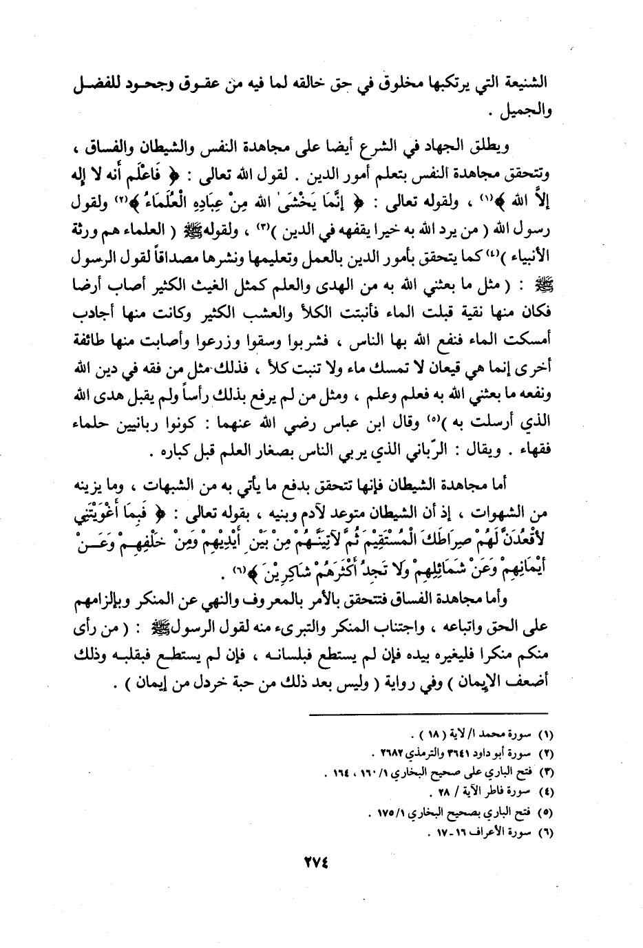 ويطلق الجهاد في الشرع أيضًا على مجاهدة النفس والشيطان والفساق، وتتحقق مجاهدة النفس بتعلم أمور الدين. لقول الله تعالى: {فَاعْلَمْ أَنَّهُ لا إِلَهَ إِلاَّ اللَّهُ} 1، ولقوله تعالى: {إِنَّمَا يَخْشَى اللَّهَ مِنْ عِبَادِهِ الْعُلَمَاءُ} 2, ولقول رسول الله: "من يرد الله به خيرًا يفقهه في الدين" 3، ولقوله, صلى الله عليه وسلم: "العلماء هم ورثة الأنبياء" 4, كما يتحقق بأمور الدين بالعمل وتعليمها ونشرها مصداقًا لقول الرسول, صلى الله عليه وسلم: "مثل ما بعثني الله به من الهدى والعلم كمثل الغيث الكثير أصاب أرضًا فكان منها نقية قبلت الماء فأنبتت الكلأ والعشب الكثير وكانت منها أجادب أمسكت الماء فنفع الله بها الناس، فشربوا وسقوا وزرعوا وأصابت منها طائفة أخرى إنما هي قيعان لا تمسك ماء ولا تنبت كلأ، فذلك مثل من فقه في دين الله ونفعه ما بعثني الله به فعلم وعلم، ومثل من لم يرفع بذلك رأسًا ولم يقبل هدى الله الذي أرسلت به" 5, وقال ابن عباس, رضي الله عنهما: كونوا ربانيين حلماء فقهاء. ويقال: الرباني الذي يربي الناس بصغار العلم قبل كباره.