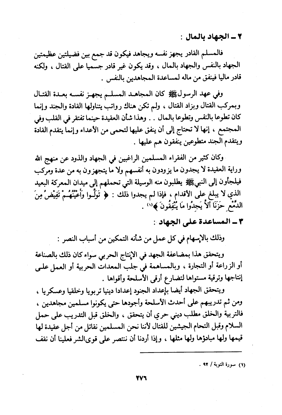 وفي عهد الرسول -صلى الله عليه وسلم- كان المجاهد المسلم يجهز نفسه بعدة القتال وبمركب القتال وبزاد القتال، ولم تكن هناك رواتب يتناولها القادة والجند وإنما كان تطوعًا بالنفس وتطوعًا بالمال..وهذا شأن العقيدة حينما تفتقر في القلب وفي المجتمع، إنها لا تحتاج إلى أن ينفق عليها لتحمى من الأعداء وإما يتقدم القادة ويتقدم الجند متطوعين ينفقون هم عليها.