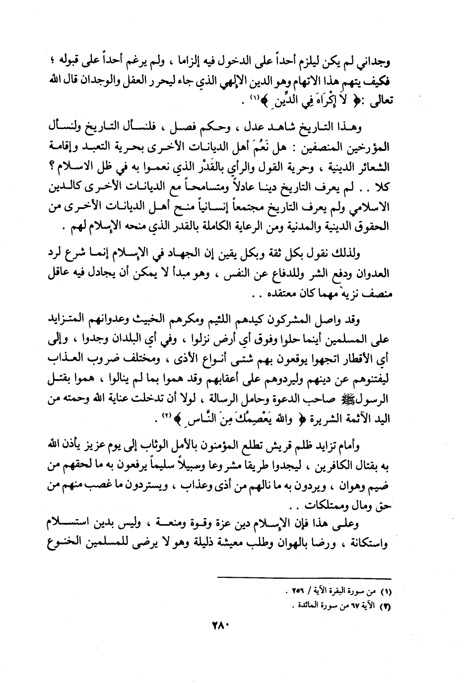 ولذلك نقول بكل ثقة وبكل يقين: إن الجهاد في الإسلام إنما شرع لرد العدوان ودفع الشر وللدفاع عن النفس، وهو مبدأ لا يمكن أن يجادل فيه عاقل منصف نزيه مهما كان معتقده..