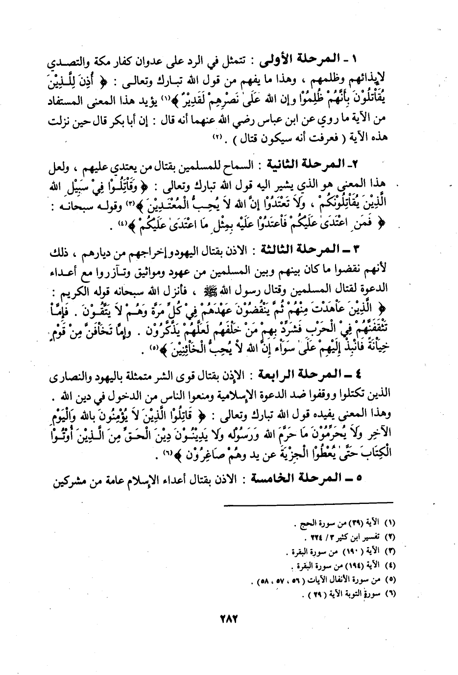 السماح للمسلمين بقتال من يعتدي عليهم، ولعل هذا المعنى هو الذي يشير إليه قول الله تبارك وتعالى: {وَقَاتِلُوا فِي سَبِيلِ اللَّهِ الَّذِينَ يُقَاتِلُونَكُمْ وَلا تَعْتَدُوا إِنَّ اللَّهَ لا يُحِبُّ الْمُعْتَدِينَ} 3, وقوله سبحانه: {فَمَنِ اعْتَدَى عَلَيْكُمْ فَاعْتَدُوا عَلَيْهِ بِمِثْلِ مَا اعْتَدَى عَلَيْكُمْ} 4.
