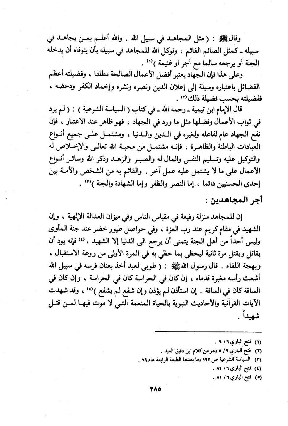 قال الإمام ابن تيمية -رحمه الله- في كتاب "السياسة الشرعية": "لم يرد في ثواب الأعمال وفضلها مثل ما ورد في الجهاد، فهو ظاهر عند الاعتبار، فإن نفع الجهاد عام لفاعله ولغيره في الدين والدنيا، ومشتمل على جميع أنواع العبادات الباطنة والظاهرة، فإنه مشتمل من محبة الله تعالى والإخلاص له والتوكيل عليه وتسليم النفس والمال له والصبر والزهد وذكر الله وسائر أنواع الأعمال على ما لا يشتمل عليه عمل آخر. والقائم به من الشخص والأمة بين إحدى الحسنيين دائمًا، إما النصر والظفر وإما الشهادة والجنة"3.