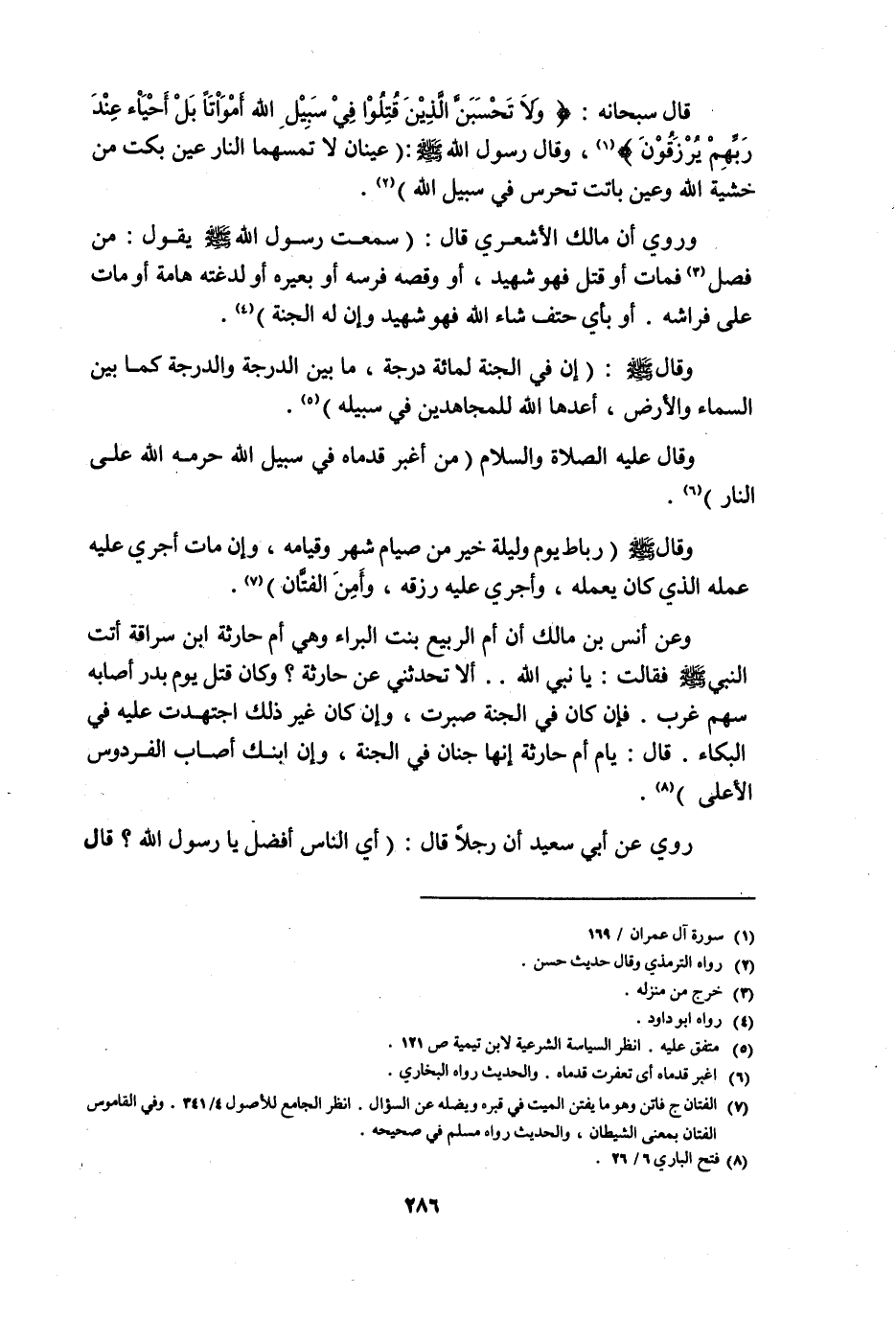قال سبحانه: {وَلا تَحْسَبَنَّ الَّذِينَ قُتِلُوا فِي سَبِيلِ اللَّهِ أَمْوَاتًا بَلْ أَحْيَاءٌ عِنْدَ رَبِّهِمْ يُرْزَقُونَ} 1، وقال رسول الله, صلى الله عليه وسلم: "عينان لا تمسهما النار: عين بكت من خشية الله وعين باتت تحرس في سبيل الله" 2.