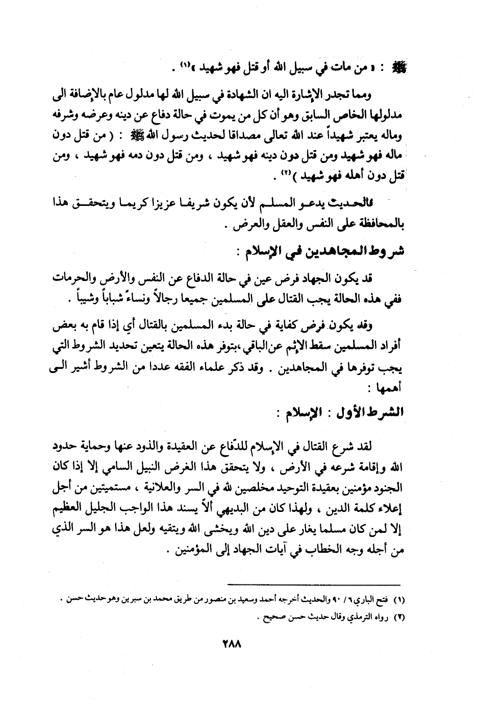 ومما تجدر الإشارة إليه أن الشهادة في سبيل الله لها مدلول عام بالإضافة إلى مدلولها الخاص السابق وهو أن كل من يموت في حالة دفاع عن دينه وعرضه وشرفه وماله يعتبر شهيدًا عند الله تعالى مصداقًا لحديث رسول الله, صلى الله عليه وسلم: "من قتل دون ماله فهو شهيد ومن قتل دون دينه فهو شهيد، ومن قتل دون دمه فهو شهيد، ومن قتله دون أهله فهو شهيد" 2.