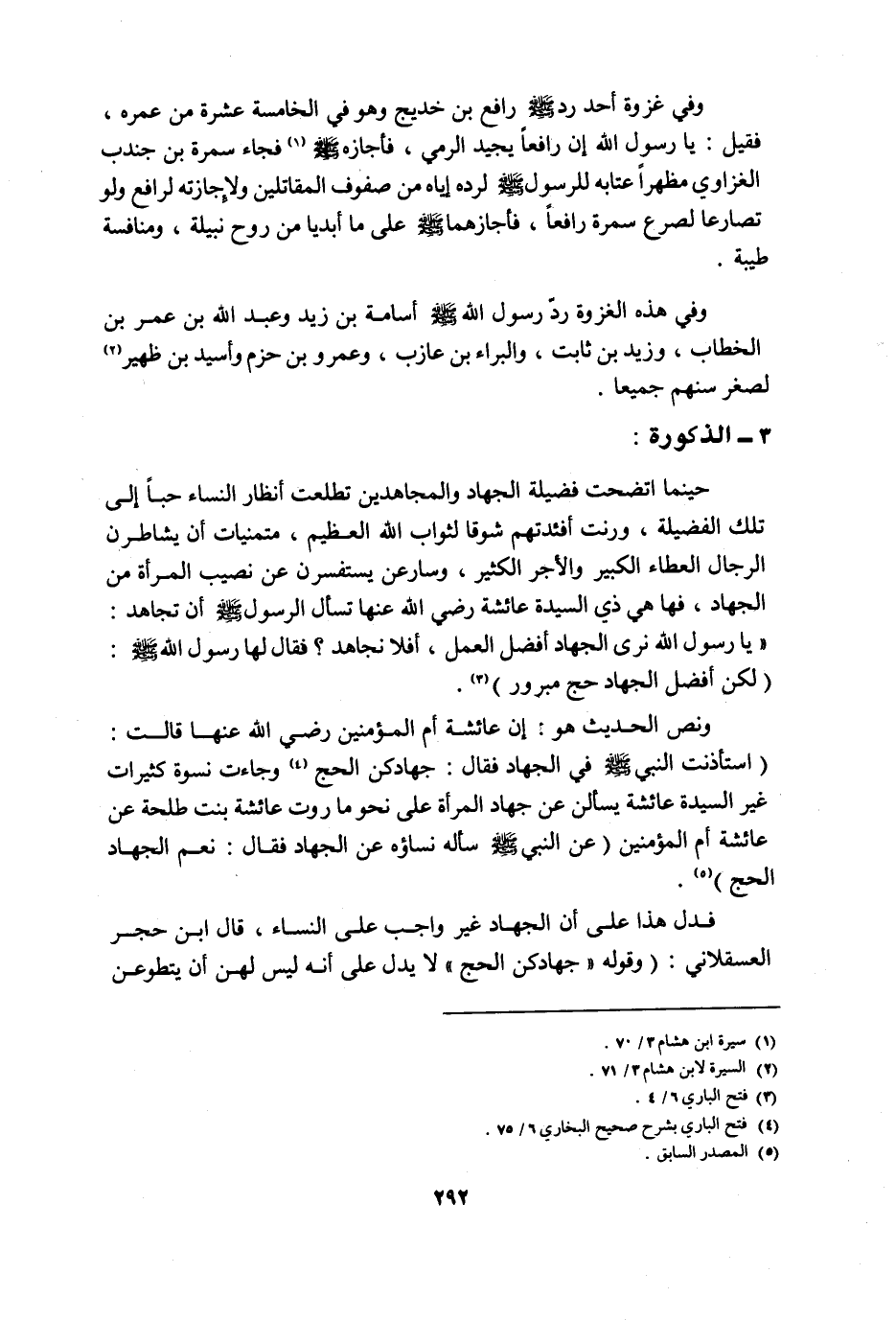ونص الحديث هو: أن عائشة أم المؤمنين -رضي الله عنها- قالت:"استأذنت النبي -صلى الله عليه وسلم- في الجهاد فقال: "جهادكن الحج" 4, وجاءت نسوة كثيرات غير السيدة عائشة يسألن عن جهاد المرأة على نحو ما روت عائشة بنت طلحة عن عائشة أم المؤمنين "عن النبي -صلى الله عليه وسلم- سأله نساؤه عن الجهاد فقال: "نعم الجهاد الحج" 5.