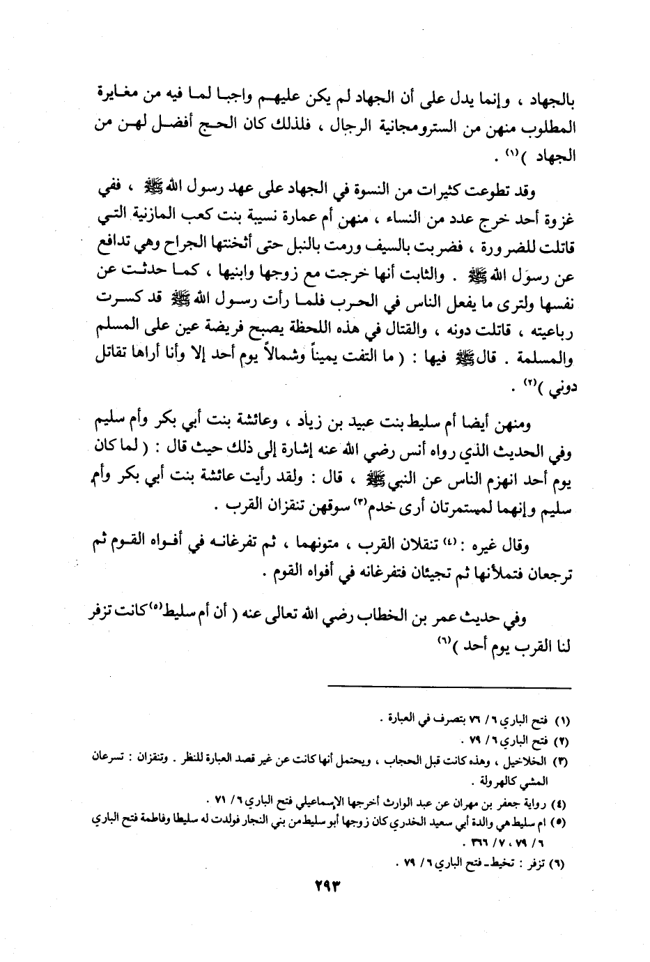 ومنهن أيضًا أم سليط بنت عبيد بن زياد، وعائشة بنت أبي بكر وأم سليم وفي الحديث الذي رواه أنس -رضي الله عنه- إشارة إلى ذلك حيث قال: "لما كان يوم أحد انهزم الناس عن النبي -صلى الله عليه وسلم- قال: ولقد رأيت عائشة بنت أبي بكر وأم سليم وإنهما لمستمرتان أرى خدم3 سوقهن تنقزان القرب".