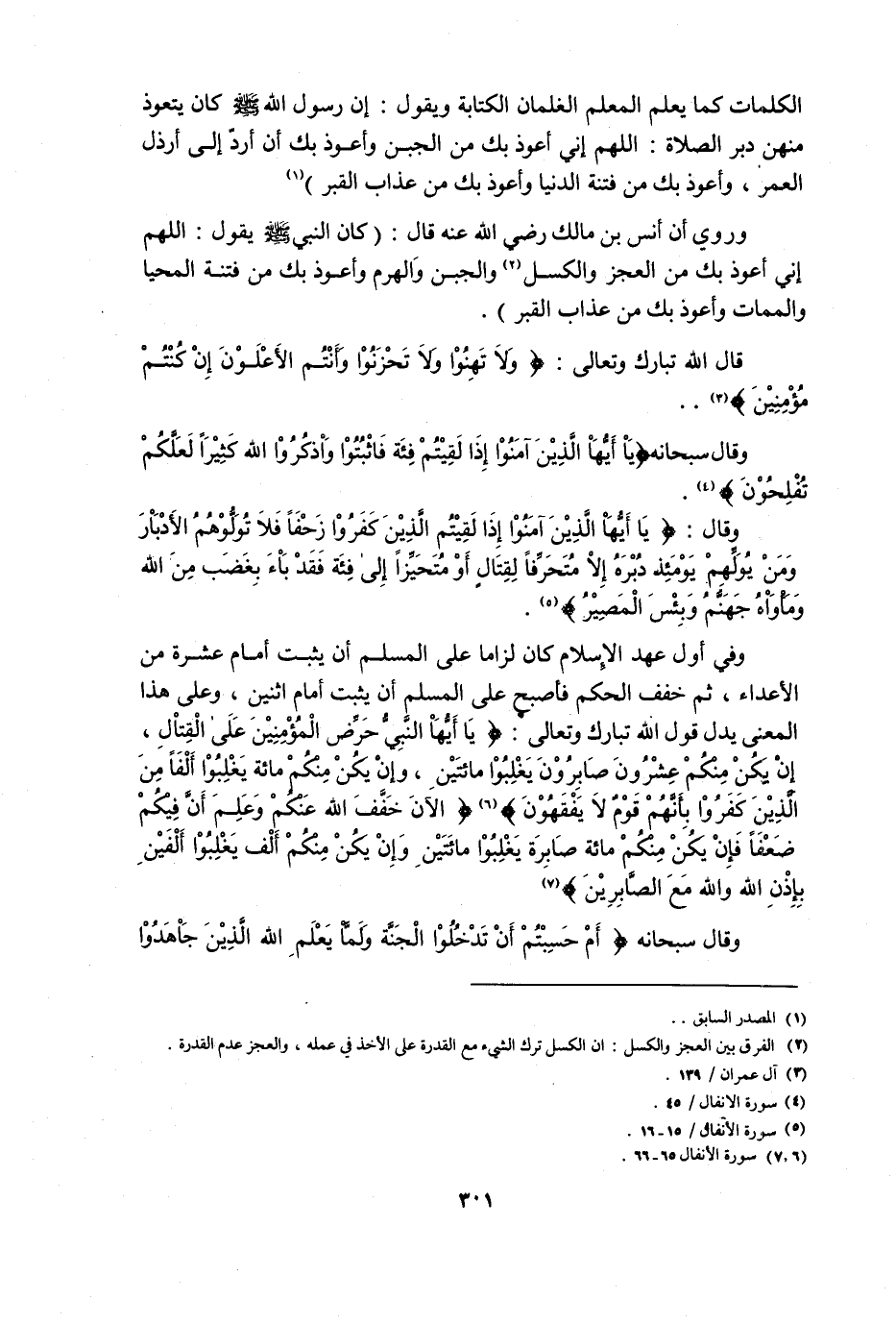 الكلمات كما يعلم المعلم الغلمان الكتابة ويقول: إن رسول الله -صلى الله عليه وسلم- كان يتعوذ منهن دبر الصلاة: "اللهم إني أعوذ بك من الجبن وأعوذ بك أن أرد إلى أرذل العمر، وأعوذ بك من فتنة الدنيا وأعوذ بك من عذاب القبر" 1.