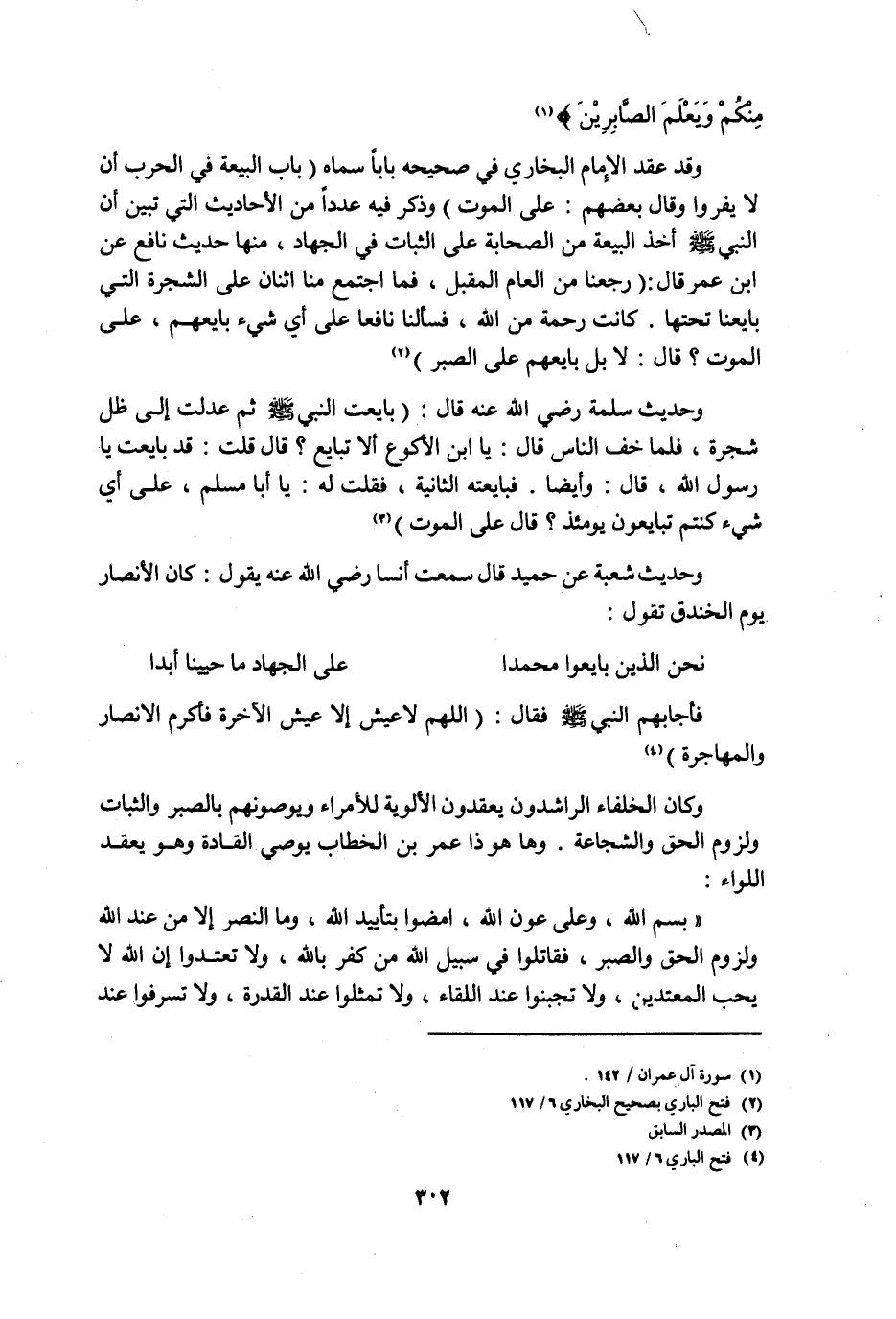 وقد عقد الإمام البخاري في صحيحه بابًا سماه "باب البيعة في الحرب أن لا يفروا وقال بعضهم: على الموت" وذكر فيه عددًا من الأحاديث التي تبين أن النبي -صلى الله عليه وسلم- أخذ البيعة من الصحابة على الثبات في الجهاد، منها حديث نافع عن ابن عمر قال: "رجعنا من العام المقبل، فما اجتمع منا اثنان على الشجرة التي بايعنا تحتها. كانت رحمة من الله، فسألنا نافعًا على أي شيء بايعهم، على الموت؟ قال: لا بل بايعهم على الصبر"2.