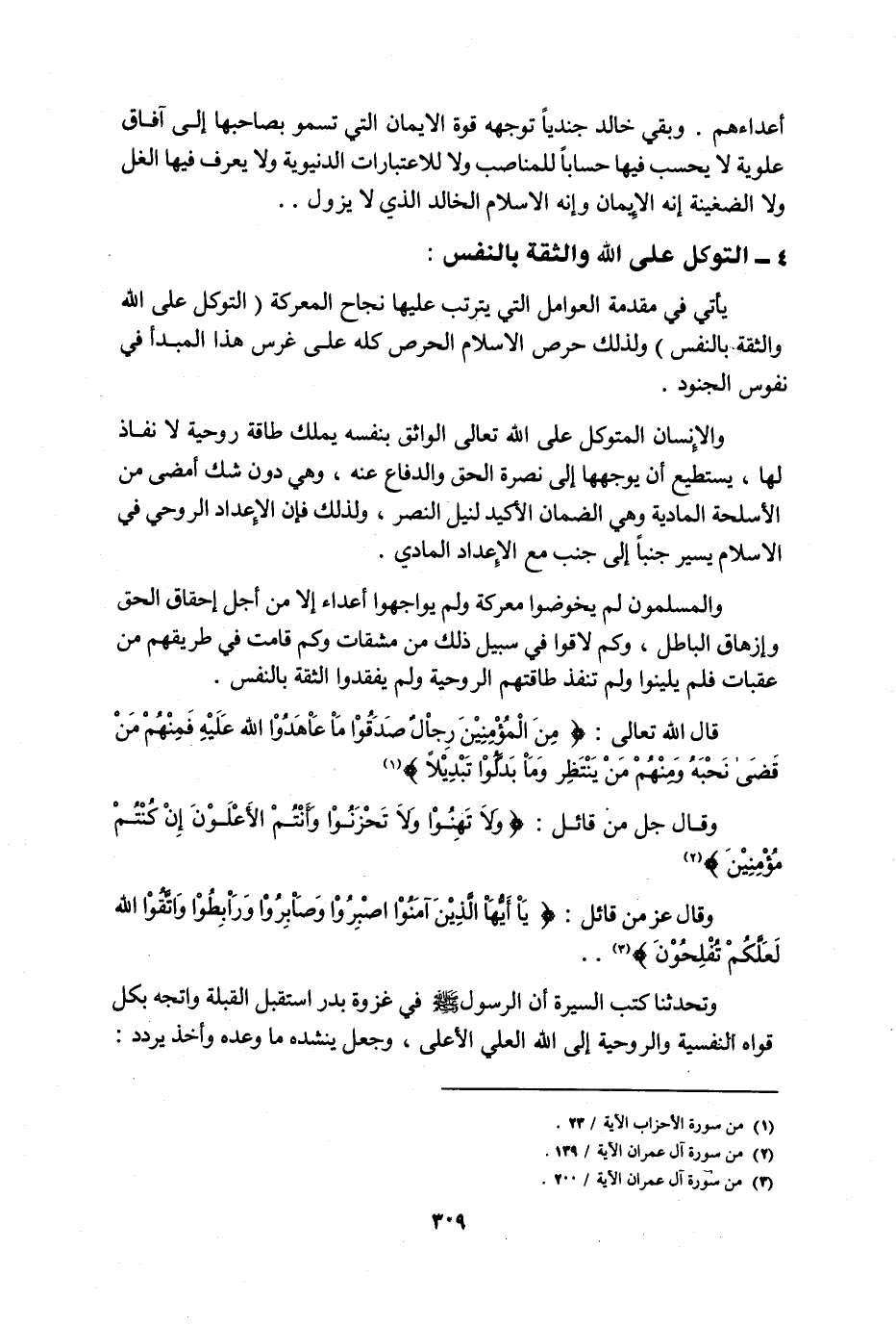 يأتي في مقدمة العوامل التي يترتب عليها نجاح المعركة "التوكل على الله والثقة بالنفس" ولذلك حرص الإسلام الحرص كله على غرس هذا المبدأ في نفوس الجنود.
